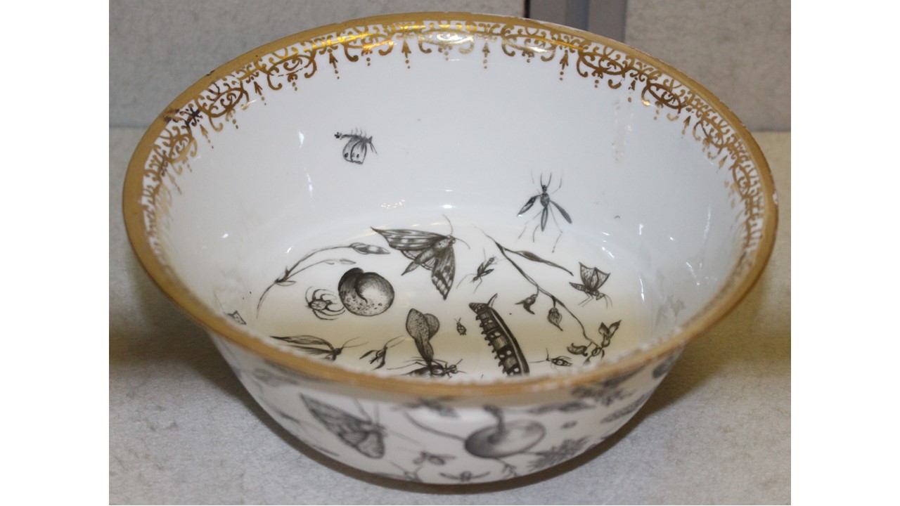 • NOTIZIE STORICO CRITICHE Il contenitore è decorato con insetti e elementi botanici mediante la tenica nota come "Schwarzlot" adottata in Germania, in particolare dagli Hausmaler di Norimberga. Sul bordo vi è un motivo in oro stilizzato "Laub und Bandelwerk". Gli elementi impiegati per la decorazione sono tratti da l'"Archetypa Studiaque Patris Georgii Höfnagelii" incisi da Jacob Höfnagel nel 1592. L'esemplare potrebbe derivare dai servizi di Gian Gastone de' Medici