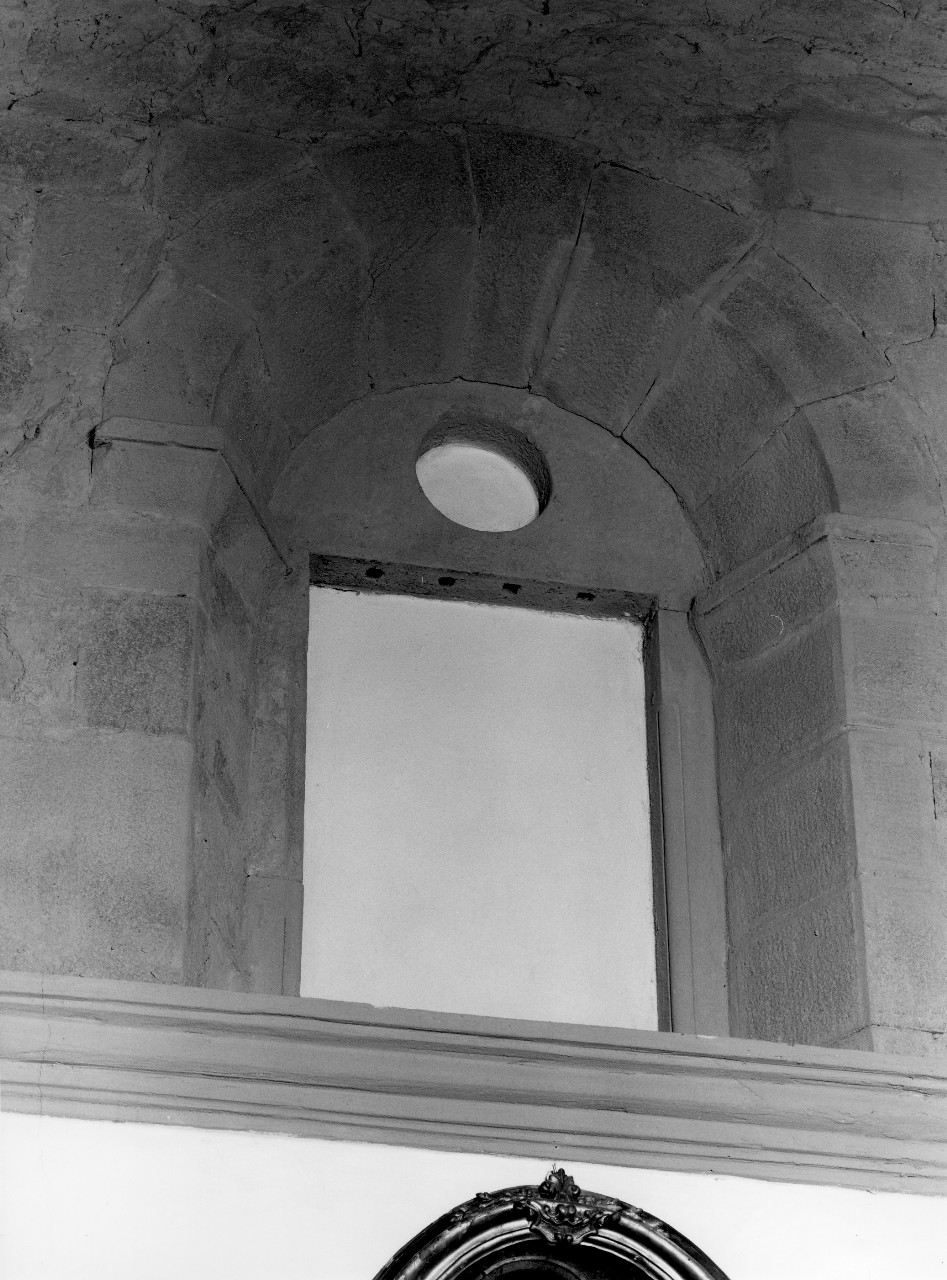 Finestra ad arco con strombatura, l'apertura originaria, attualmente murata, è di un riquadro e di un piccolo oculo al centro in alto