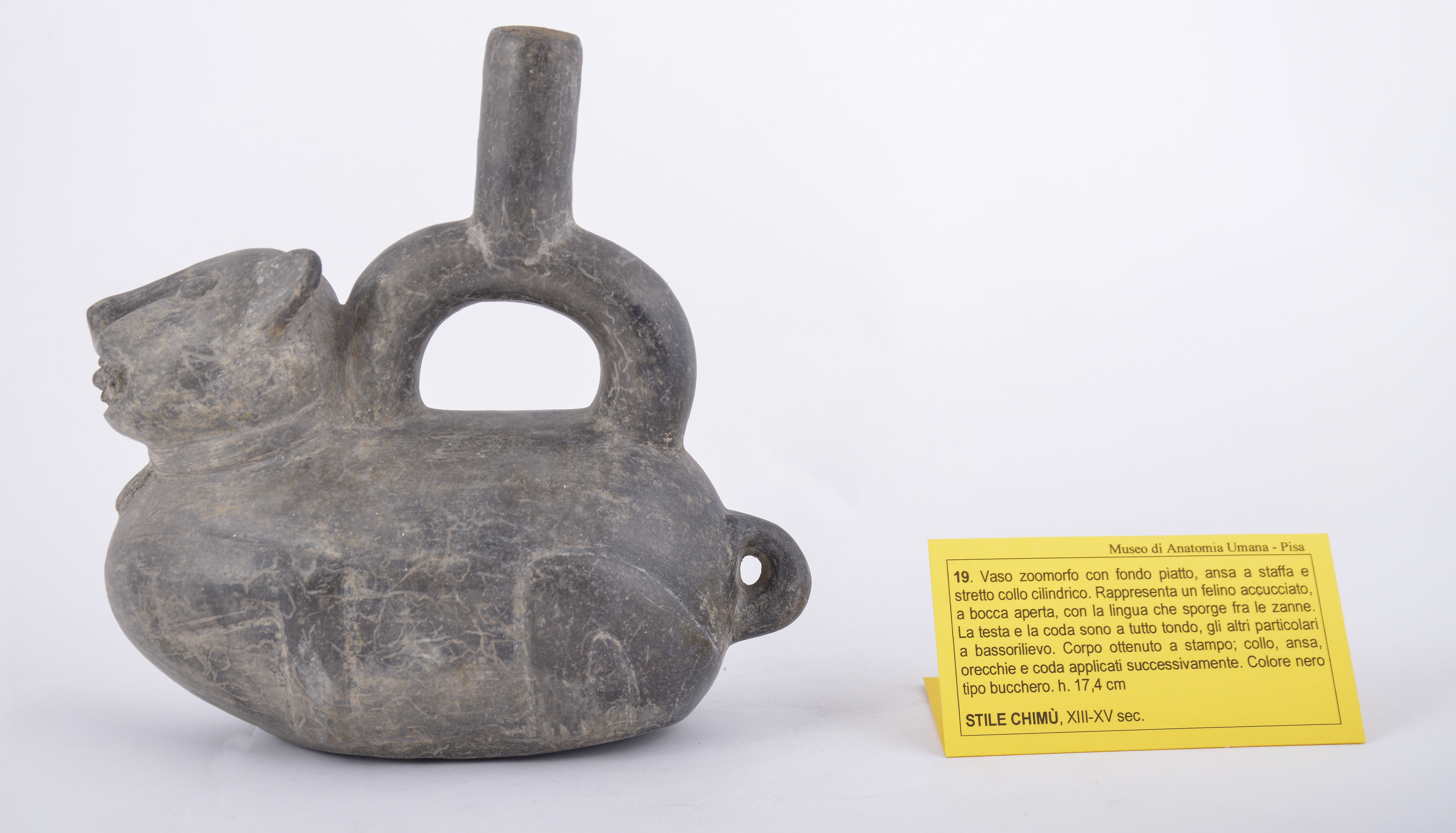 - NOTIZIE STORICO CRITICHE Il vaso in oggetto è stato rinvenuto grazie agli scavi effettuati da Carlo Regnoli in Perù nel 1869. Medico e studioso dell'Università di Pisa, essendo appassionato di archeologia, donò l'intera collezione al Museo di Anatomia Umana tra il 1860 e il 1870, dove si trovano tutt'ora. Si tratta di un vaso con funzione funeraria di colore nero che ricorda il bucchero, con testa di felino, stile tipico del regno Chimù. Il regno Chimù occupò la zona settentrionale del Perù prima dell'invasione degli Inca, che li sconfissero definitivamente tr ail 1462 e il 1470. La grande quantità di testimonianze che si conservano di questa cultura mostrano quanto fosse importate ancora all'epoca della conquista: gli Inca stessi furono influenzati dal modello del sistema stradale dei Chimù. Il colore nero, simile al bucchero, veniva ottenuto cuocendo i vasi in un'atmosfera povera di ossigeno: questo tipo di cottura era possibile solo in un forzo vero e proprio che permettesse la regolazione dell'apertura delle prese d'aria. Un altro studioso sostiene che tale colore potesse essere ottenuto con falò all'aperto creati all'interno di grandi buche scavate nel terreno, dove , una volta raggiunta una temperatura elevata, si aggiungeva ulteriore combustibile per poi coprire il fuoco con la sabbia, in questo modo si produceva fumo sufficiente a determinare questa colorazione. Il culto eliaco del felino era considerato di seconda importanza in epoca Chimù: probabilmente perchè il sole sulla costa arida e desertica non aveva molta importanza. Il culto del Sole si diffuse quando venne imposto alle popolazione della sierra e regredi nei Periodi Intermedi. Soltanto con l'arrivo degli Inca si riaffermò il culto del Sole