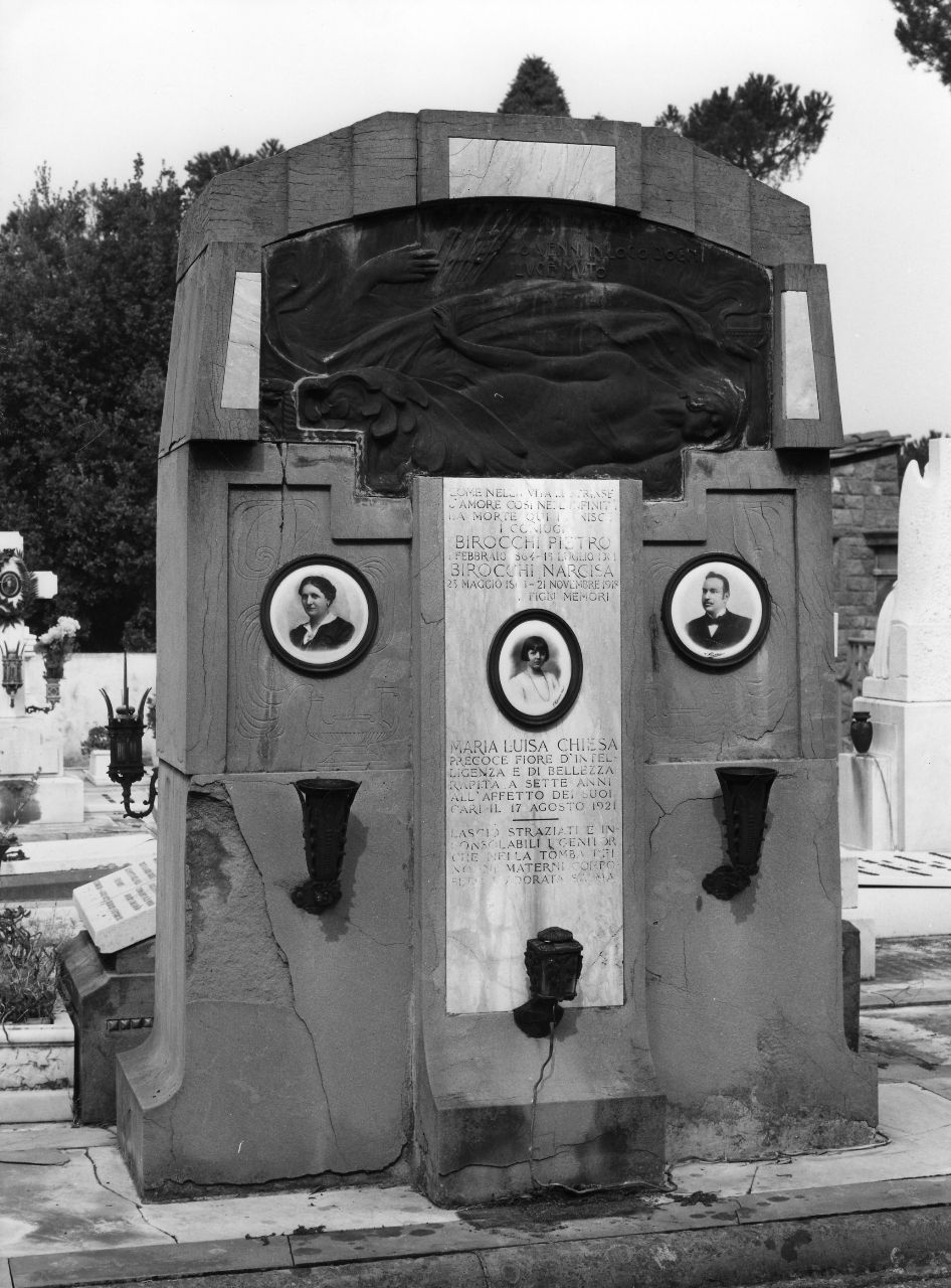 - ISCRIZIONI nella lastra di marmo, sulla fronte del monumento - COME NELLA VITA LI STRINSE / L'AMORE COSÌ NELL'INFINITÀ / LA MORTE QUI RIUNISCE I CONIUGI / BIROCCHI PIETRO / 1° FEBBRAIO 1864_15 LUGLIO 1901/ BIROCCHI NARCISA / 23 MAGGIO 1865_21 NOVEMBRE 1918 / I FIGLI MEMORI / - lettere capitali -