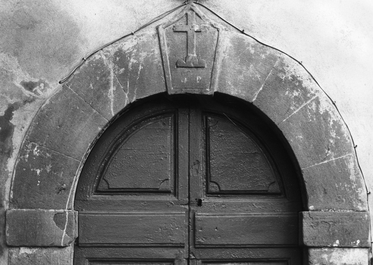 Portale costituito da arco di arenaria a tutto sesto terminante in chiave d'arco elaborato. L'arco poggia su due stipiti di arenaria; il portone sembra essere quello originale