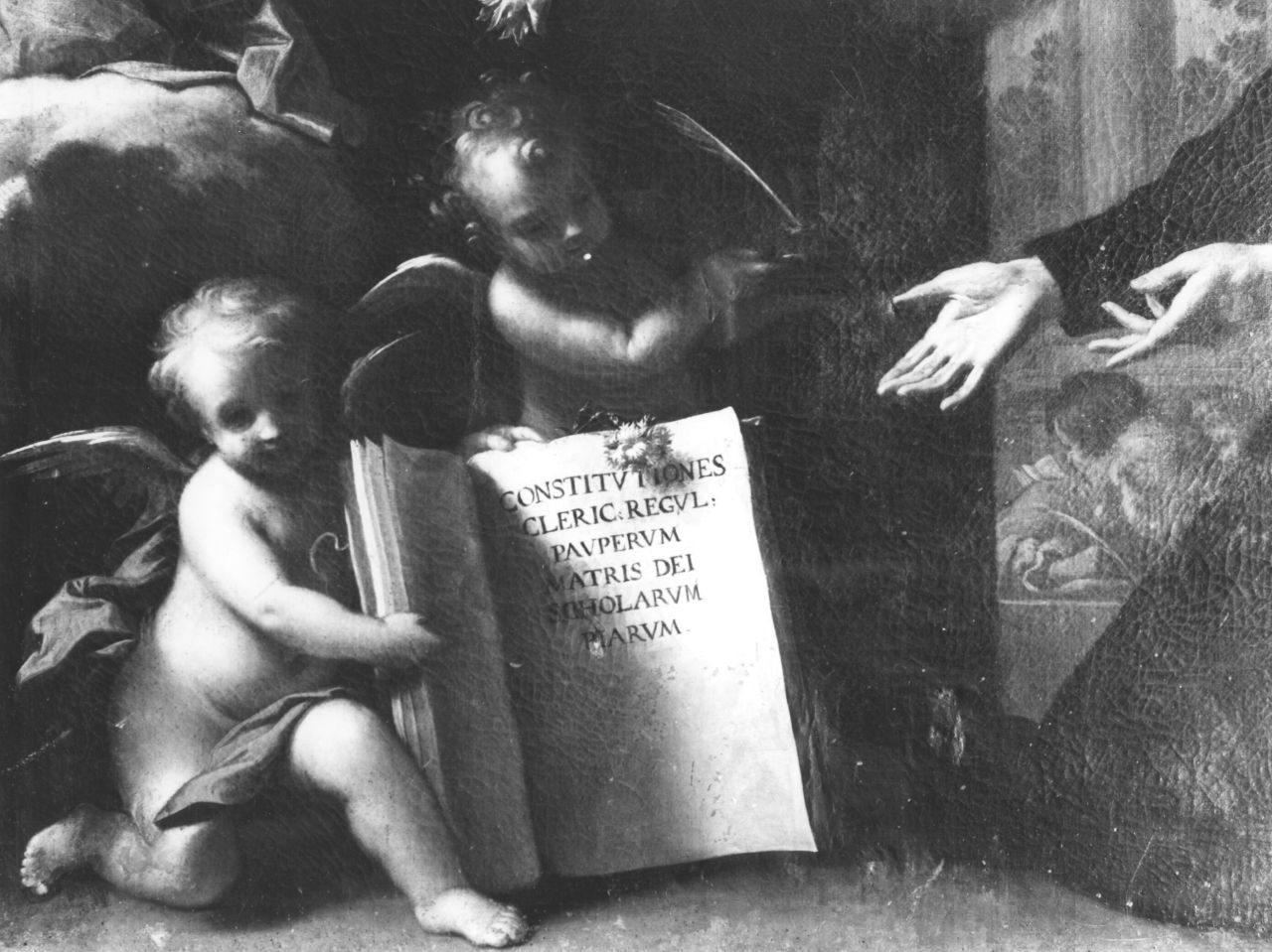 - ISCRIZIONI nel libro sorretto dai putti - CONSITUTIONES/ CLERIC REGUL/ MATRIS DEI/ SCHOLARUM/ PIARUM - lettere capitali - a pennello -