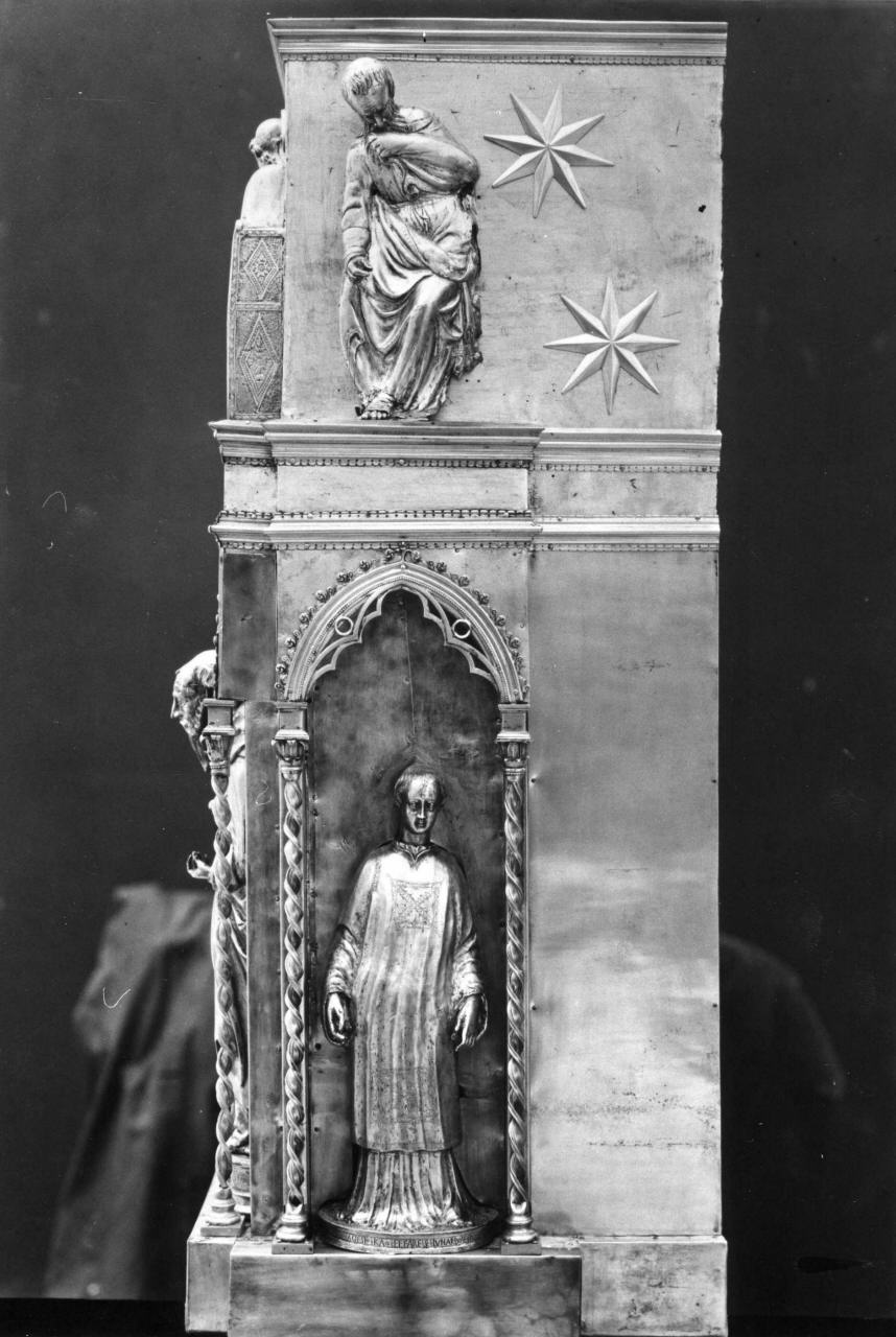 - NOTIZIE STORICO CRITICHE Attraverso due diversi accordi contrattuali furono incaricate di completare i fianchi del dossale due diverse compagnie di orafi: l'una composta da Niccolao di Ser Guglielmo e Atto di Piero Braccini con Domenico da Imola, l'altra da Leonardo di Mazzeo Ducci e Piero di Giovannino con "Pippo da Firenze", ovvero Filippo Brunelleschi al suo esordio. I due esecutori designati, Domenico da Imola, e il Brunelleschi, dovettero offrire agli operai un saggio della loro abilità artistica. Tuttavia un primo contratto stipulato nel 1399 fu parzialmente modificato il 7 febbraio 1400. I cambiamenti tendevano a risparmiare la quantità di argento utilizzato ma anche un parziale mutamento degli incarichi assunti dalle due compagnie di orafi che dovettero scambiarsi il "lato" dell'altare da compiere. Difficile chiarire il motivo di questo mutamento, forse semplicemente dettato dalla volontà di privilegiare la compagnia che sembrava offrire maggiore continuità nel lavoro offrendogli il lato più visibile per non lasciarlo incompleto. Alla fine del 1401 un inventario rende ragione di che cosa fosse stato compiuto dalle due compagnie: tre figure intere, cioè S.Gregorio e Girolamo (lavorate dalla compagnia di Niccolao di Ser Guglielmo) e S.Agostino (eseguito dal Brunelleschi); due mezze figure di evangelisti di cui quella di San Giovanni fatta dalla compagnia di Niccolao e quella di S.Matteo da quella di Leonardo, più il "fioretto" che si trovava solo nel lato verso il Duomo, compiuto dalla compagnia di Niccolao. Sulla metà del XV secolo ai fianchi aggiunsero statuette altri orafi, tra i quali il mediocre Piero d'Antonio da Pisa. La critica è concorde nell'assegnare al Brunelleschi due busti di profeti, Geremia e Isaia, già segnalati come opera di Brunelleschi dalla biografia del Manetti e dal Vasari poi. Secondo Lucia Gai "Il giovane Brunelleschi faceva qui presentire l'impetuosa interpretazione che avrebbe dato del tema del Sacrificio di Isacco nella formella approntata nel 1401 per il concorso delle porte del Battistero di Firenze". L'altare, rimasto incompleto all'aprirsi del XV secolo, fu protetto negli anni seguenti da un grande armadio ligneo dipinto che riproduceva le decorazioni interne. Il fianco rivolto verso la sacrestia fu finito soltanto nel 1447 quando si affidò all'orafo Piero d'Antonio da Pisa, la statua di S.Giusto vescovo. E' forse da ascrivere allo stesso artefice un'altra statuetta raffigurante San Leonardo probabilmente realizzata nel corso del 1449 o nel 1450. Una delle ultime parti realizzate dell'altare, compiuta nel 1456 da Piero d'Antonio da Pisa che completò due busti di profeti, Daniele e David più la statua di San Marco, insieme con i fiori d'argento dorato. La figura è ispirata alla prima porta ghibertiana per il Battistero di Firenze