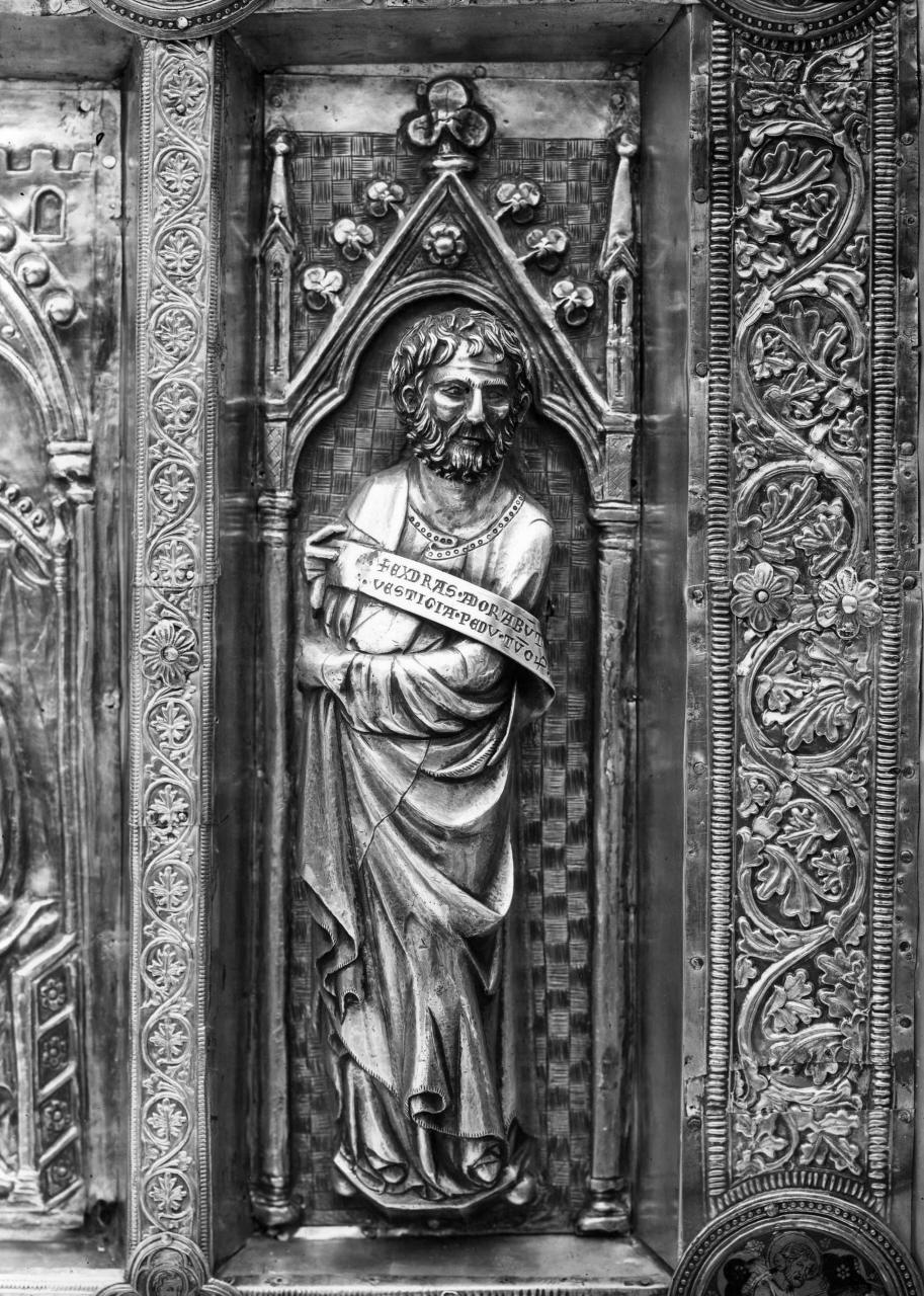 - NOTIZIE STORICO CRITICHE I profeti sono stati collocati ai lati del paliotto centrale in seguito al restauro. Le statue dovettero essere già compiute nel 1363 dal momento che sono citate nell'inventario redatto in quell'anno. Come scrive Lucia Gai "facevano parte dell'ampliamento dell'altare argenteo di San Jacopo, realizzato fra il 1330 e il 1363 (anno in cui fu compilato un inventario assai analitico, che fornisce indicazioni dettagliate in proposito), la predella della "tabula super altare" e il coronamento di questa con il Crocifisso, Maria e San Giovanni, già eseguiti nel 1340; le sei figure di profeti entro edicola, posti ai due lati del paliotto frontale. Nel loro insieme i sei profeti appaiono eseguiti da una stessa mano per l'omogeneità del linguaggio figurativo, sono in relazione con una cultura artistica in cui i modi di Giovanni Pisano appaiono ormai divulgati, fino a divenire, vera e propria maniera". Concludendo, l'artefice risultava "certamente informato sui contemporanei sviluppi della scultura e dell'oreficeria a Firenze, Siena e Pisa (..) uno fra i diversi orafi operosi in Pistoia o per Pistoia nella prima metà del 300". Più difficile definire accanto a quale formella fosse posizionato, dal momento che l'iscrizione che reca nel cartiglio: "Adorabunt vestigia pedum tuorum", il contenuto del versetto potrebbe adattarsi sia alla scena delle Marie al sepolcro sia a quella con l'Incredulità di tommaso, che era la prima a sinistra dell'ultima fila in basso