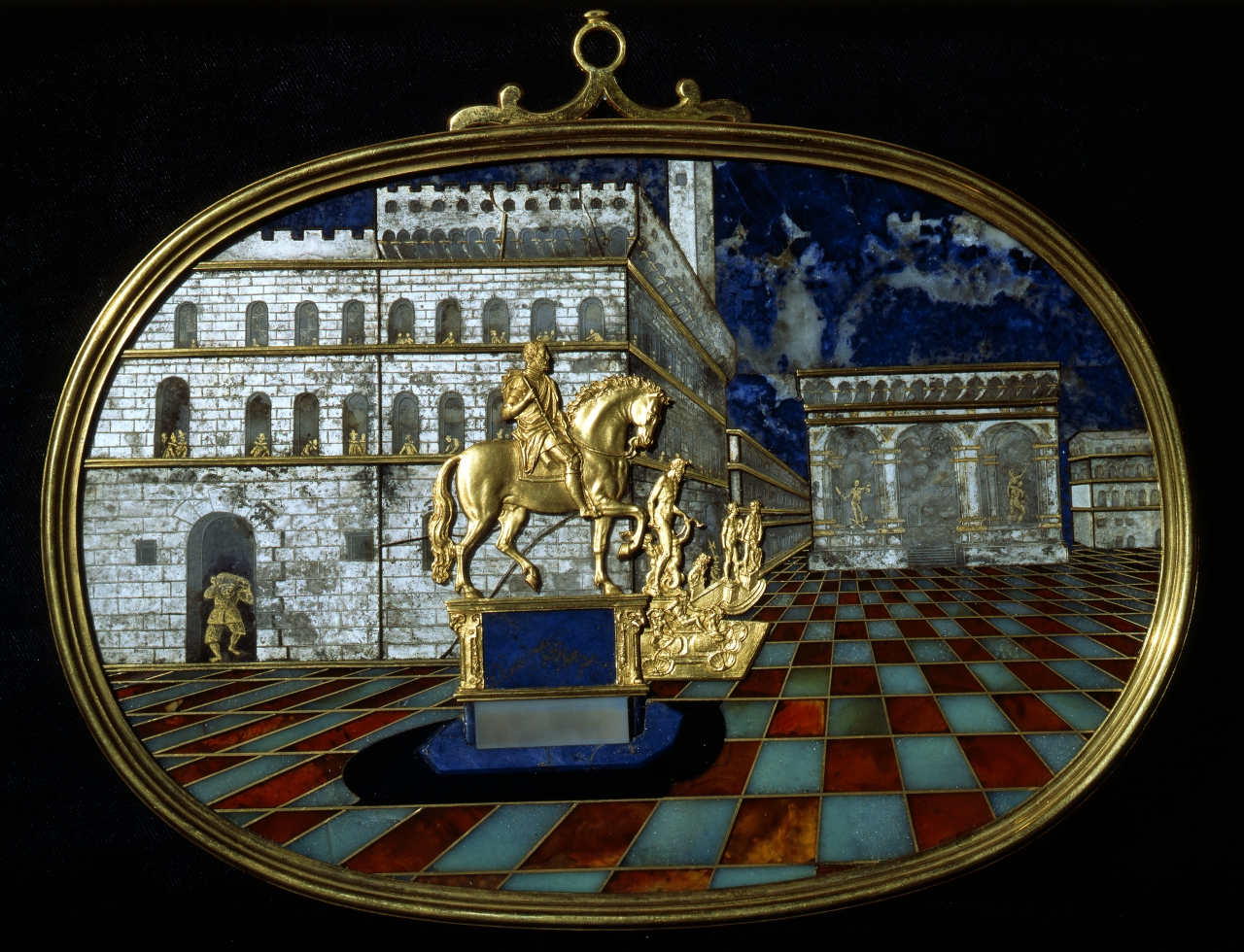 - NOTIZIE STORICO CRITICHE La prospettiva della Piazza della Signoria fu eseguita dall'intagliatore milanese Bernardino Gaffuri, figlio gel Giorgio Gaffuri che lavorava nel Casino di San Marco dal 1575. Il contratto con l'intagliatore (per scudi 150) data 12 luglio 1599 (Heikamp, 1963, doc. 46). Come modello il Gaffuri usò l'anonima incisione in legno della piazza, pubblicata nel 1583 (Heikamp, 1963, fig. 48). Il rilievo d'oro, rappresentando la statua equestre di Cosimo I di Giambologna accanto alle sculture davanti a Palazzo Vecchio, fu fatta da Jacopo Biliverti, come risulta dal conto del 1 dicembre 1600 (Fock, 1974, p. 176). Il rilievo era destinato allo studiolo nella Tribuna, eseguito per il Granduca Ferdinando I fra il 1593 e il 1602. Nel 1780 lo studiolo intero era stato mandato nel R. Gabinetto di Fisica (Filza, Soprintendenza, XIII, del 1780, ins. 123), mentre nel 1805 era già smantellato e l'ovale si trovava nel tesoro della Guardaroba Generale in Palazzo Vecchio, insieme ai due rilievi nn. 821 e 822, in oro del tempietto (v. A. S. F., Revisioni e Sindacati 70, n. 64). Il 27 settembre 1823 fu con loro riportato in Galleria (vedi Giornale 1784, p. 214)