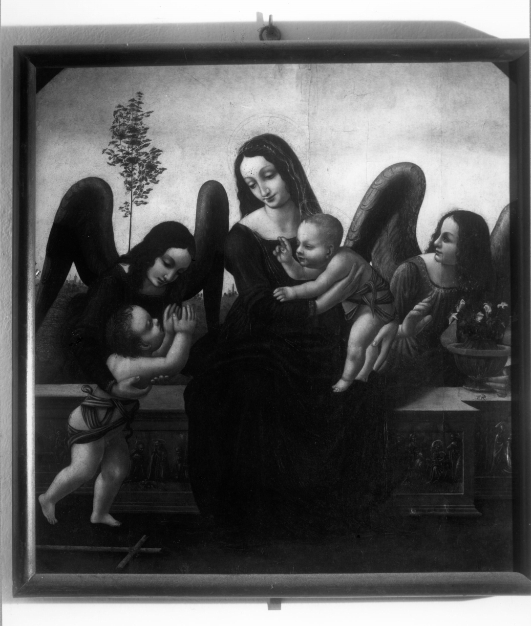 - NOTIZIE STORICO CRITICHE L’inventario SOLENNE (1888), compilato subito dopo l’acquisizione della collezione Carrand da parte del museo del Bargello, annota il “Dipinto su Tavola di forma quadrata rappresentante La Madonna col Bambino Gesù ed Angeli. Scuola Lombarda. Risorgimento”, seguito dal successivo inventario FERRI (1889), mentre SUPINO (1898) ne precisa l’appartenenza al XVI secolo; la CRUTTWELL (1908) lo vede esposto nella “hall of the armour”, l’odierna sala del Duca d’Atene, trovandolo “a charming composition” ed assegnandolo come SUPINO alla scuola lombarda del Cinquecento; le schede dattiloscritte della collezione Carrand aggiungono la datazione alla prima metà del secolo (sono anonime, ma basate su note di SUPINO riviste da Filippo ROSSI nel primo dopoguerra come direttore del Bargello; com.or.del caposervizio del museo, Moscadelli). La didascalia della foto Alinari, infine, dove il dipinto non mostra stanziali variazioni rispetto allo stato attuale, lo intitola Santa Famiglia attribuendolo a Marco d’Oggiono. Da qualche tempo si trova negli uffici del museo, e non ha partecipato alla mostra per il centenario della donazione di Louis Claude Carrand di tutta la sua collezione al Bargello (1989). Come dimostra l’inventario SOLENNE, la tavola aveva già una forma quadrangolare al momento del passaggio al Bargello: originariamente però doveva essere centinata od almeno, se rettangolare, incorniciata a centina per la presenza di angoli scuri ai lati; in epoca imprecisata è stata tagliata in alto e ridotta al formato attuale. Stilisticamente, nonostante il favorevole giudizio della CRUTTWELL, rivela una composizione piuttosto manierata e priva di spontaneità; la patina che ricopre il dipinto offusca e smorza i colori ed ostacola una lettura attenta dell’opera, riferibile all’ambiente lombardo del dopo-Leonardo: tuttavia la didascalia Alinari, facendo il nome di Marco d’Oggiono, dovrebbe averne individuato l’ambiente di provenienza; Marco, i cui panneggi sono più luminosi e condotti diversamente, usa un chiaroscuro più sfumato e modella le figure con meno risalto plastico, oltre a piccole differenze come il modo di dipingere le nubi e la forma delle ali degli angeli. Tuttavia la Madonna col Bambino ed angeli del Museo di Blois, elemento di un doppio trittico formato e datato proprio in questo pannello MARCI OGIONIS P., rivela molti punti di contatto con la tavola del Bargello, tanto da far pensare che l’autore sia stato vicino a Marco dopo il suo apprendistato nello studio milanese di Leonardo (1490), del resto compiuto in giovanissima età: le opere documentate dell’artista di Oggiono, malgrado l’abbondante produzione, sono solo I tre arcangeli di Brera e la Madonna col Bambino e Santi del 1524, nella chiesa parrocchiale di Besate presso Abbiategrasso, oltre il doppio trittico ora a Blois. Il dipinto del Bargello è dunque opera di un ignoto seguace di Marco d’Oggiono, ed è databile ai primi decenni del XVI secolo