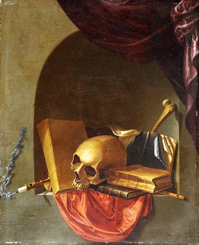 - NOTIZIE STORICO CRITICHE Il dipinto insieme al suo 'pendant' (09/ 00131401) , fu inviato da Pitti alla Villa della Petraia nel 8-5-686 (Guar. 903 c.49 v, ASF). Uni ca altra opera nota di quest'artista è il quadretto di soggetto analogo , firmato, nell'Istituto d'Arte di Detroit. Nulla è noto di quest'artis ta che dallo stile sembra attivo intorno alla metà del secolo. Ico nograficamente le sue composizioni si avvicinano a una corrente fiamm inga, ma stilisticamente le sue opere sono olandesi. Il tema del 'memento mori' o 'vanitas' trova nella pittura dei Paesi Bassi particola re sviluppo nel XVII secolo