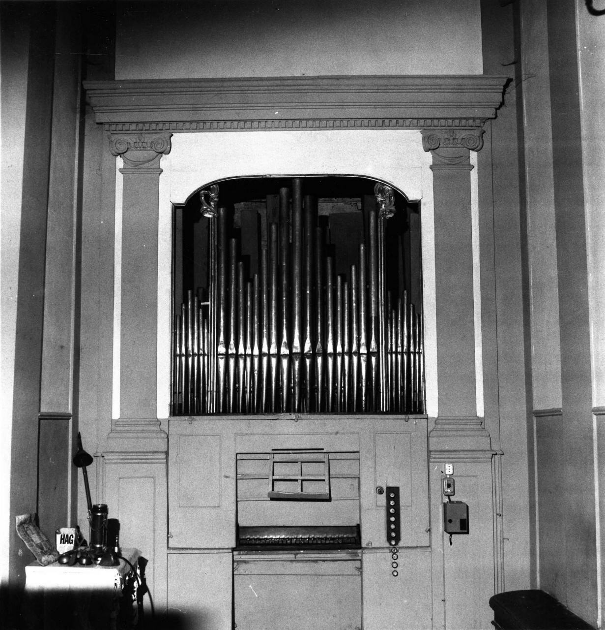 Organo posto sul pavimento a sinistra del coro in cella organaria. Originariamente era collocato in cantoria sopra la porta d'ingresso. Prospetto della cassa originale tinta a tempera grigia e bianca. Facciata di 31 canne a cuspide centrale e ali laterali con 2 cuspidi laterali più piccole divise da paraste (7-4-9-4-7). Bocche allineate, labbro superiore a mitria