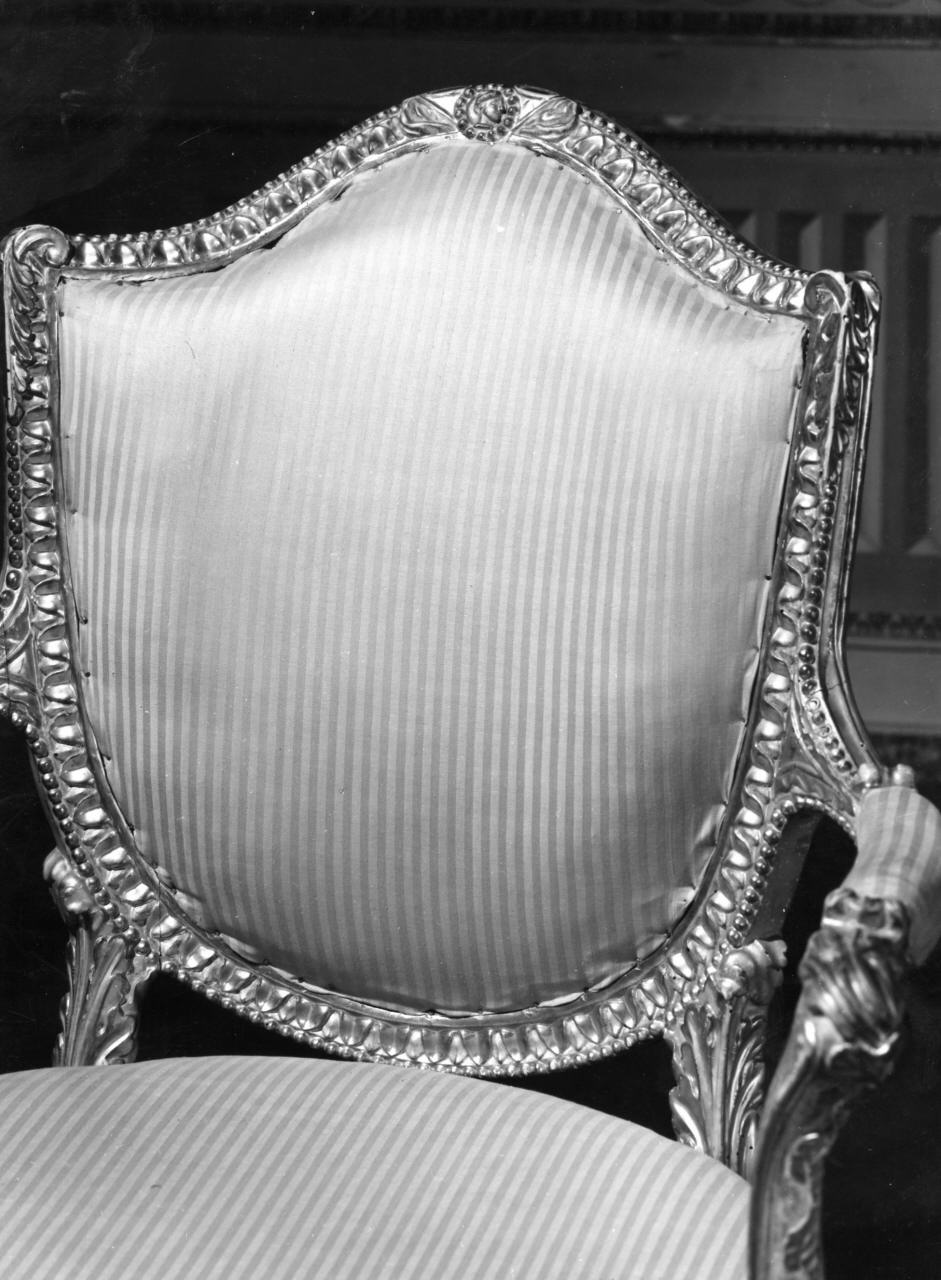poltrone di legno dorato e intagliato; piedi a piramide, spalliera a scudo. Fasce intagliate a fregio con fogliami. In alto alla spalliera ed in mezzo alla fascia anteriore del sedile vi è un piccolo intaglio a medaglione perlato con in mezzo un profilo