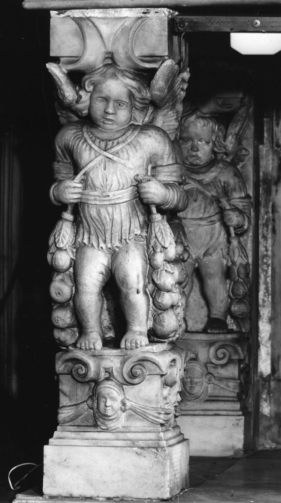 Quattro colonnine reggi-mensa in marmo bianco scolpito. Le due colonne anteriori sono scolpite da entrambe i lati, quelle posteriori sono addossate al muro. Sulle basi con mascheroni e volute poggiano degli angioletti - telamone uniti per la schiena e legati tra loro da festoni di frutta. Al di sopra plinti con volute avvolgenti