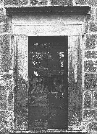 Cornice perimetrale a nastro liscio, alti stipiti, architrave sormontato da cornice modanata aggettante