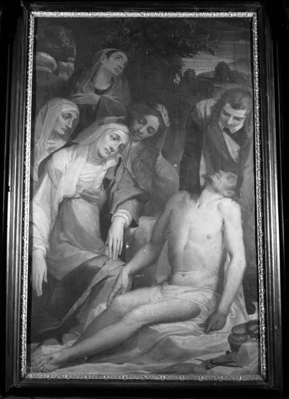 La composizione si articola in senso ascensionale attorno alla figura del Cristo morto, disteso sul sudario e sorretto da una figura virile (san Giovanni ?) vestito d'abiti cinquecenteschi con manto rosa e veste nera. Tutta la parte sinistra del quadro è occupata dal gruppo delle Pie Donne, disposto a piramide, che sorreggono la Vergine colta in atto di sconforto, sottolineato dall'andamento plastico delle pieghe della veste, di color rosa acceso e fortemente lumeggiata, sulla quale si dispone il manto blu. Sul vertice della piramide quasi a cesura del dinamismo ascensionale della composizione, che parte dalla figura del Cristo, è la Maddalena raffigurata in atteggiamento doloroso. Nella parte superiore il dipinto si apre su uno sfondo paesaggistico tutto giocato su toni verdi che contrastano sul gioco dei rosa, dei blu, e dei bianchi del gruppo delle figure. A destra la veduta del Golgota su cui si innalzano 2 croci. A sinistra entro un arco di roccia, 2 teste d'uomo con turbanti. Nell'angolo in basso a destra, sul sudario sono disposti i simboli della Passione, e sopra una scritta, di epoca posteriore, ripetuta più in basso in rosso a destra