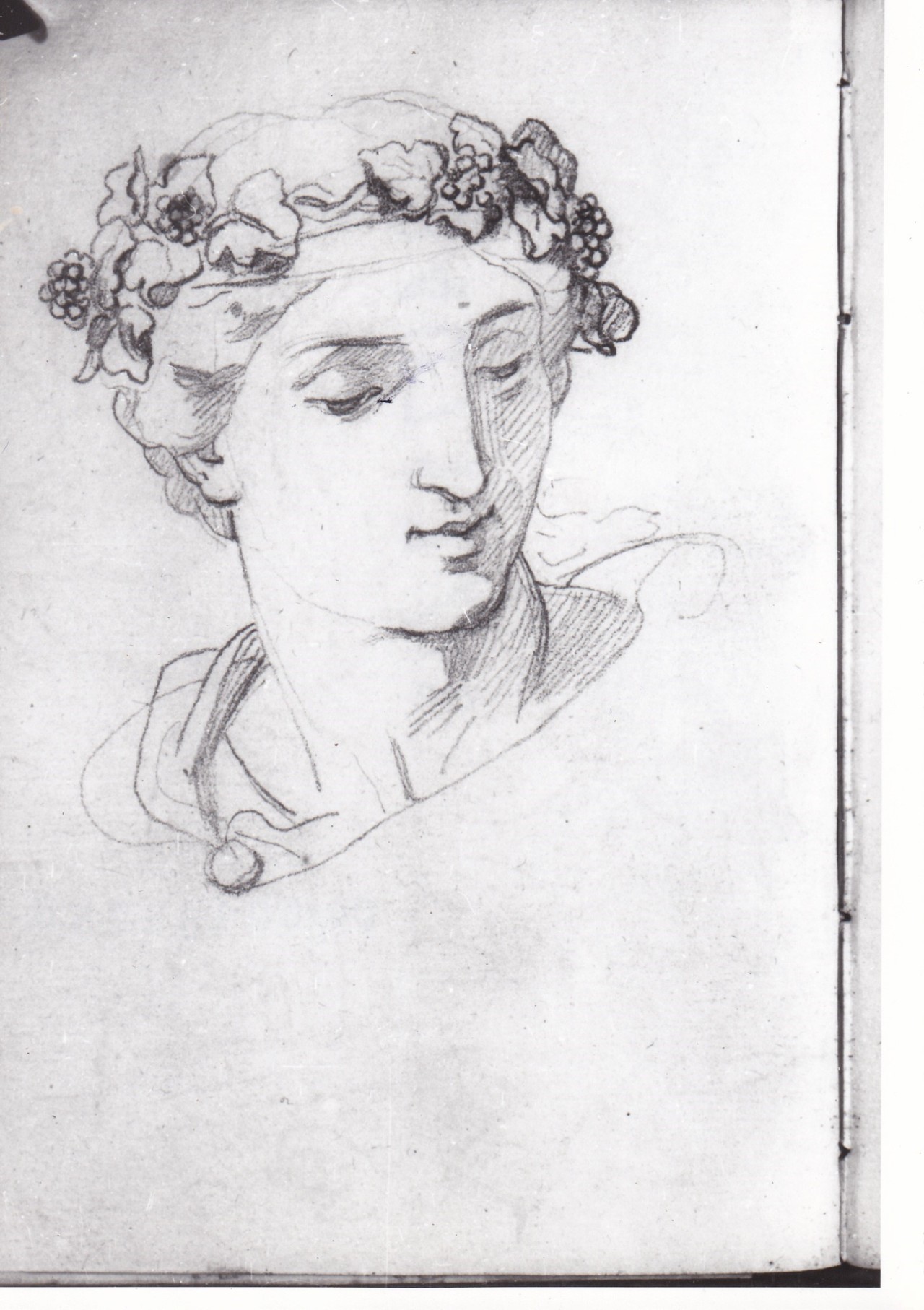 - NOTIZIE STORICO CRITICHE Recto: Il disegno sufficientemente condotto a termine, presenta caratteri stilistici analoghi a molti altri fogli di questi taccuino in cui figurano vedute e paesaggi. Anche qui, infatti, sono evidenti la rapidità del disegno, condotto a masse generali chiazzate, soprattutto nel fogliame, con un chiaroscuro condotto a tratti paralleli di matita. Non saprei identificare il luogo qui rappresentato. Verso: Studio eseguito da qualche marmo antico, direi del tipo dell'Apollo sauroctono, forse veduto dall'artista nel corso del suo viaggio a Roma e a Napoli dell'inverno 1818-1819. Nel taccuino infatti, esistono altri disegni dall'antico, sicuramente eseguiti dall'artista in quelle città (vedi schede n. 2341.29, 37, 41, 45)