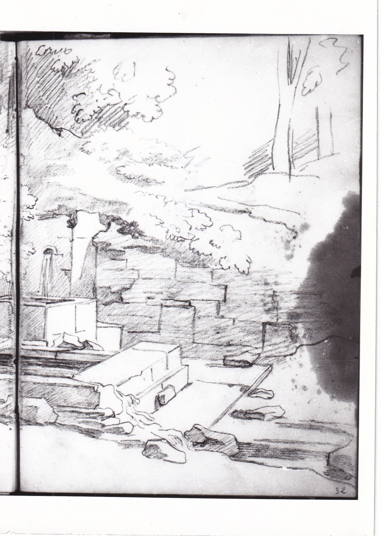 Recto: Paesaggio boscoso con in primo piano una fontana costruita con lunghi conci di pietra. Verso: Paesaggio collinare boscoso appena abbozzato