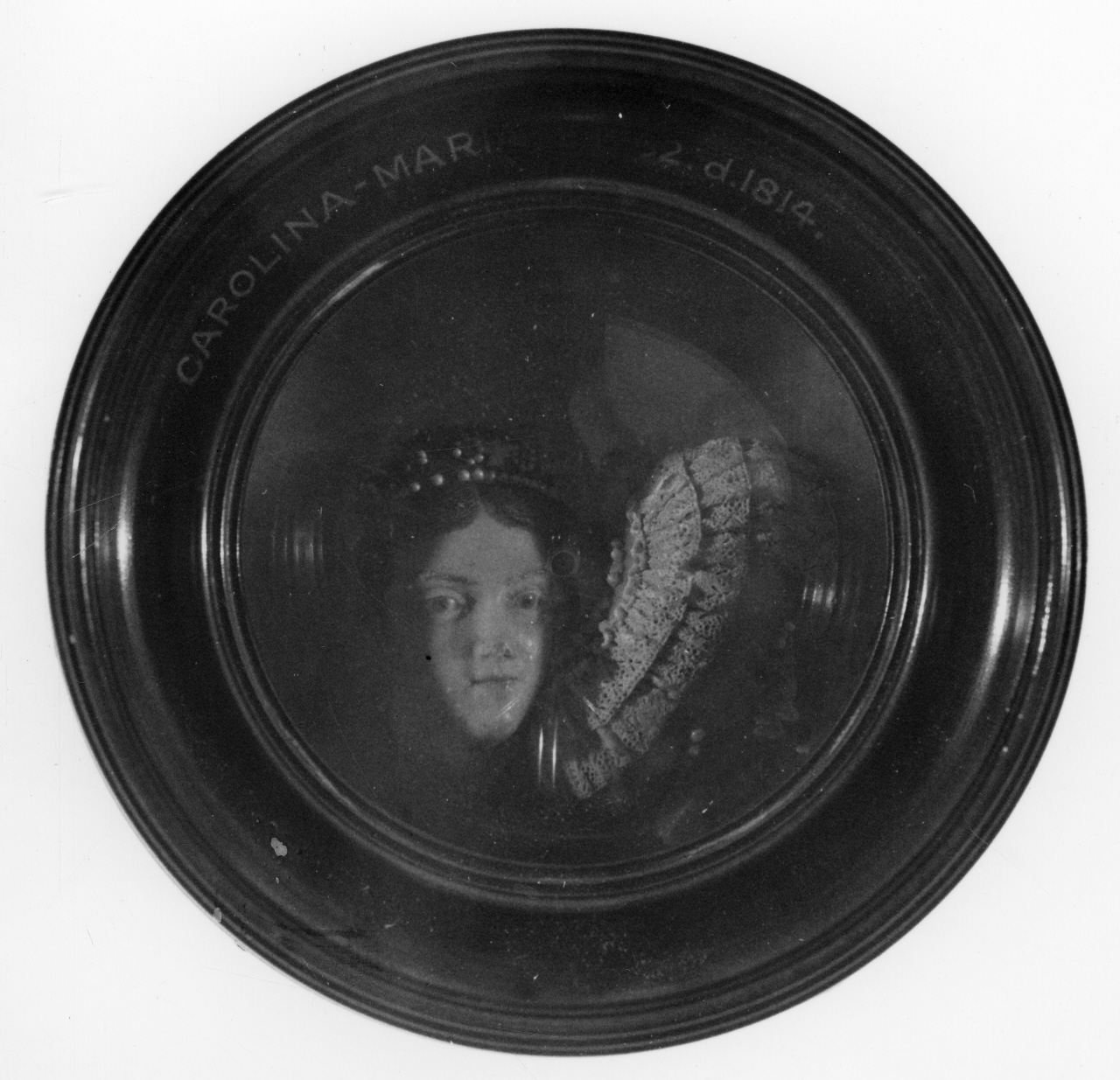 Rilievo in cera policroma su fondo in vetro raffigurante un busto femminile di fronte (Maria Giuseppa Amalia di Sassonia). Cornice rotonda in legno con vetro convesso di protezione