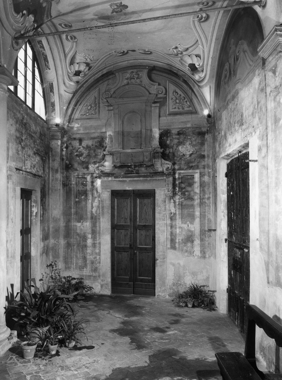 - NOTIZIE STORICO CRITICHE Il 1° Maggio 1743, con una scritta autografa, il pittore Francesco Maria Papi si impegnò a dipingere gratis io stesso le muraglie e volta del primo ingresso, purchè mi siano somministrati i colori, pennelli ed ogn'altro possa occorrere (ASF, Comp. Soppr. N1531, F, c. 121r). I lavori iniziarono nel mese successivo (ivi, c. 123r9. Francesco Maria Papi partecipò gratuitamente, insieme al padre Domenico, alla decorazione del vestibolo e della volta dell'oratorio (cfr. schede relative), restaurò quadri e dipinse la Cantoria, armadi di sagrstia e molte robe macchinose in occasioni di funerali (ACSN Cassetta B, Fascicolo 1 D II, c. 5). Del Papi conosciamo solo un'altra opera, l'affrescatura della volta dell'oratorio dei Bini, eseguiti nel 1752. (cfr. G. Richa 1762). Gli affreschi arricchiscono la semplicità degli elementi architettonici dell'ambiente, creando illusionistici portali e ricche decorazioni