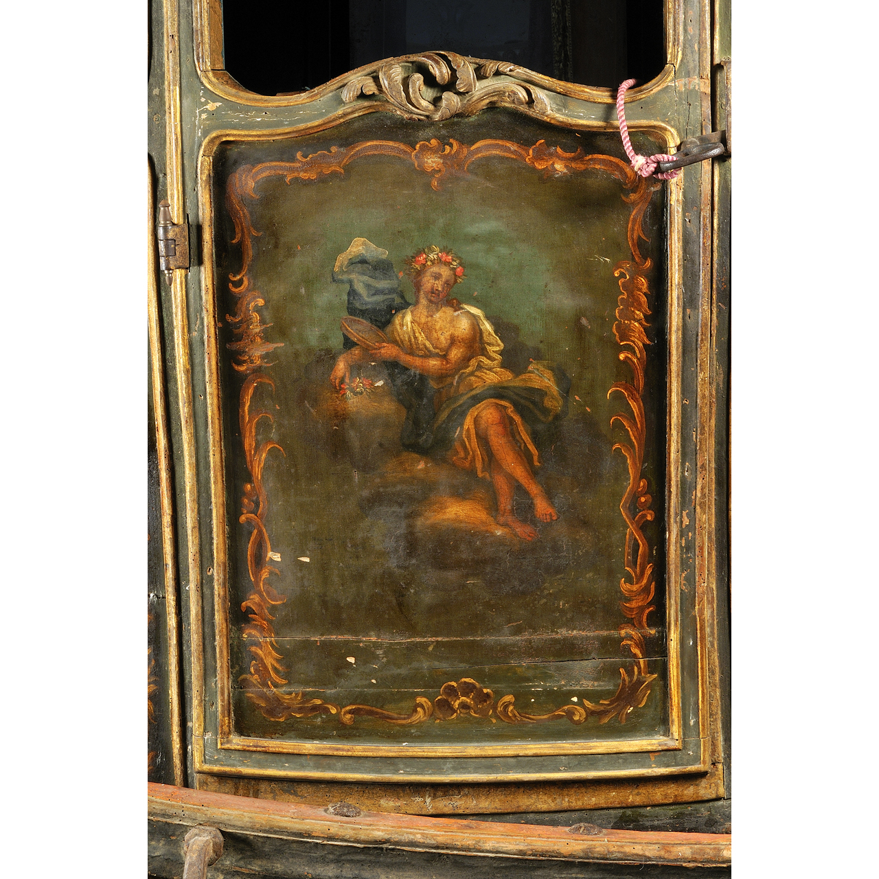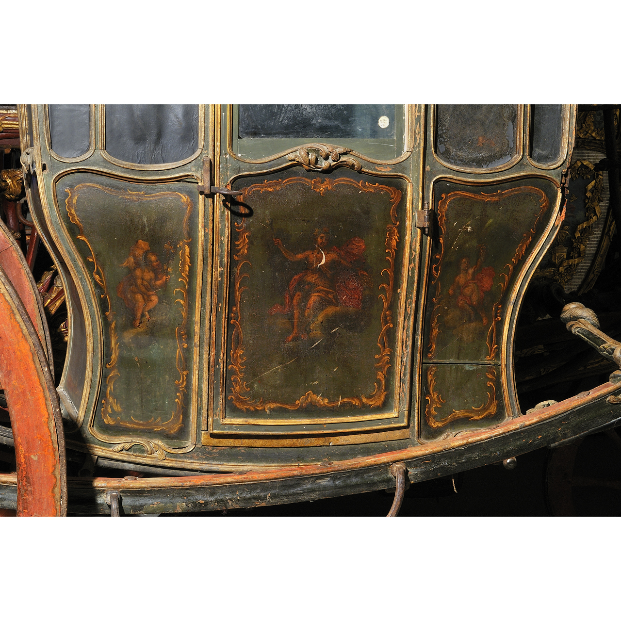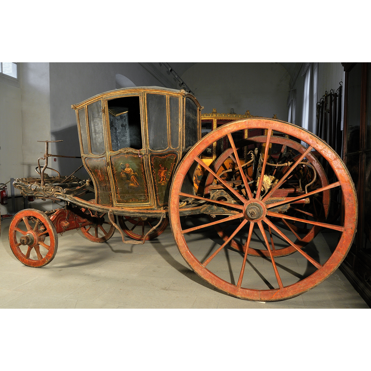 - NOTIZIE STORICO CRITICHE La carrozza con ogni probabilità aveva una destinazione signorile data l'e leganza e la ricercatezza dei moduli stilistici. Veicolo destinato ai perc orsi brevi e cittadini, è da inserire negli anni 1730/ 1750 sia per la str uttura della cassa che per la ricca decorazione del carro che rievoca moti vi rococò. Si ignora l'origine della carrozza e persino il momento in cui venne a far parte della collezione