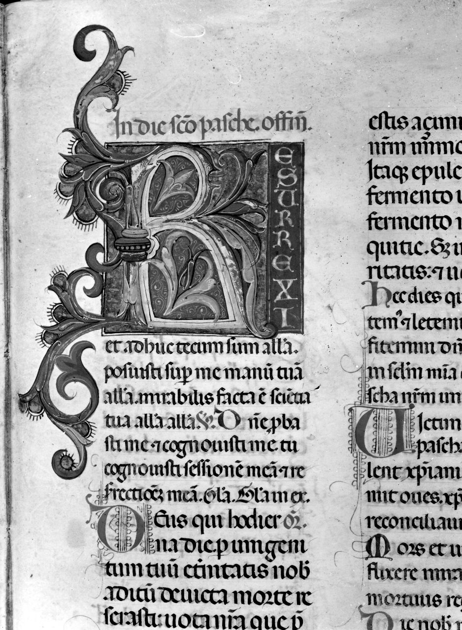 Iniziale media decorata R (esurrexi et adhuc), rubr. In die sancto Paschae