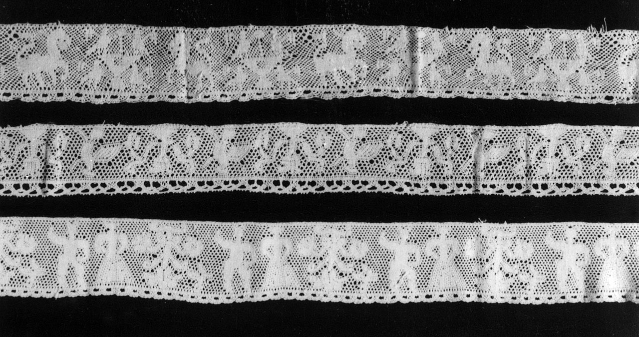 Merletto paesano eseguito su fondo a maglie miste con il motivo figurato di un uomo e di una donna che si alternano ad un motivo floreale stilizzato. La balza è rifinita da un piccolo bordo a valve di conchiglie. Il fondo a maglie miste, usato nei merletti fiamminghi in particolare di Valenciennes è costituito da maglie esagonali che hanno un piccolo foro a ciascun angolo, dovuto alla separazione dei fili nella lavorazione