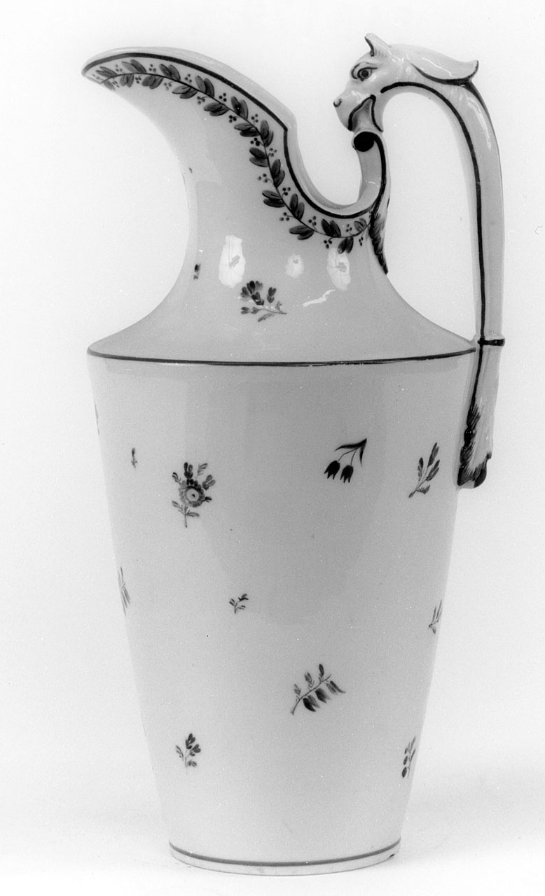 Brocca decorata a fiorellini sparsi e ghirlanda di vitalba lungo la bocca e ansa terminante nella parte superiore con una testa di drago(?)
