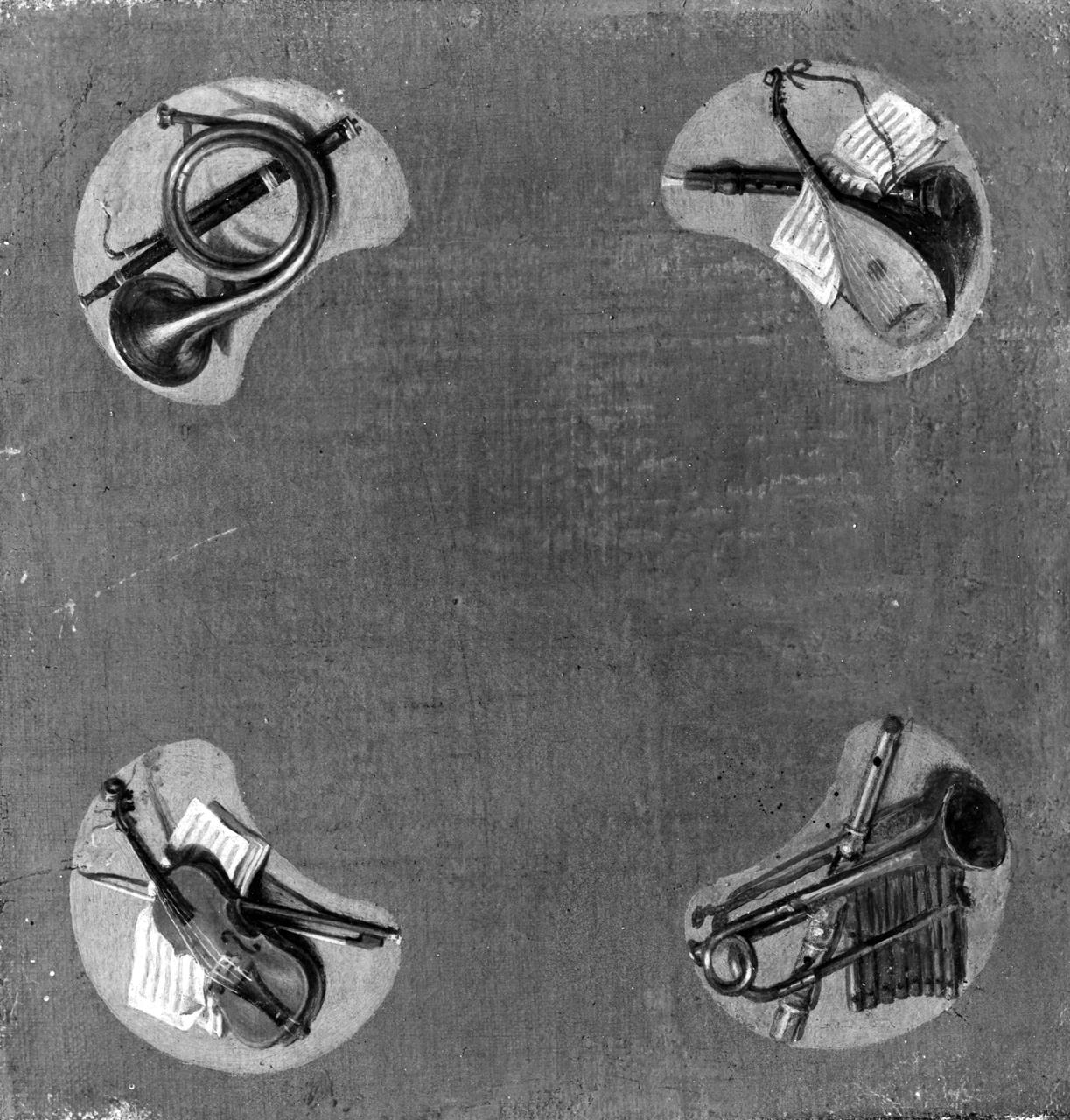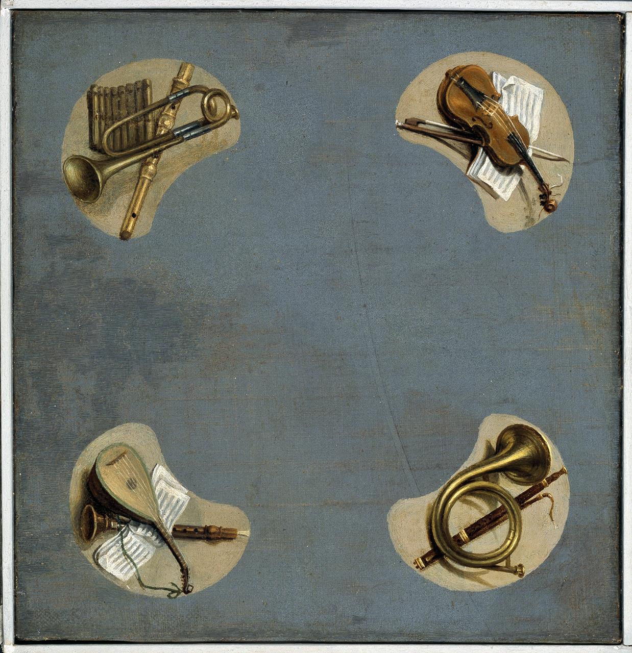Dipinto quasi perfettamente quadrangolare. Ai quattro angoli presenta emblemi della musica: un violino, spartito musicale, flauto, tromba e zufolo, mandola e clarino su spartito, corna e oboe