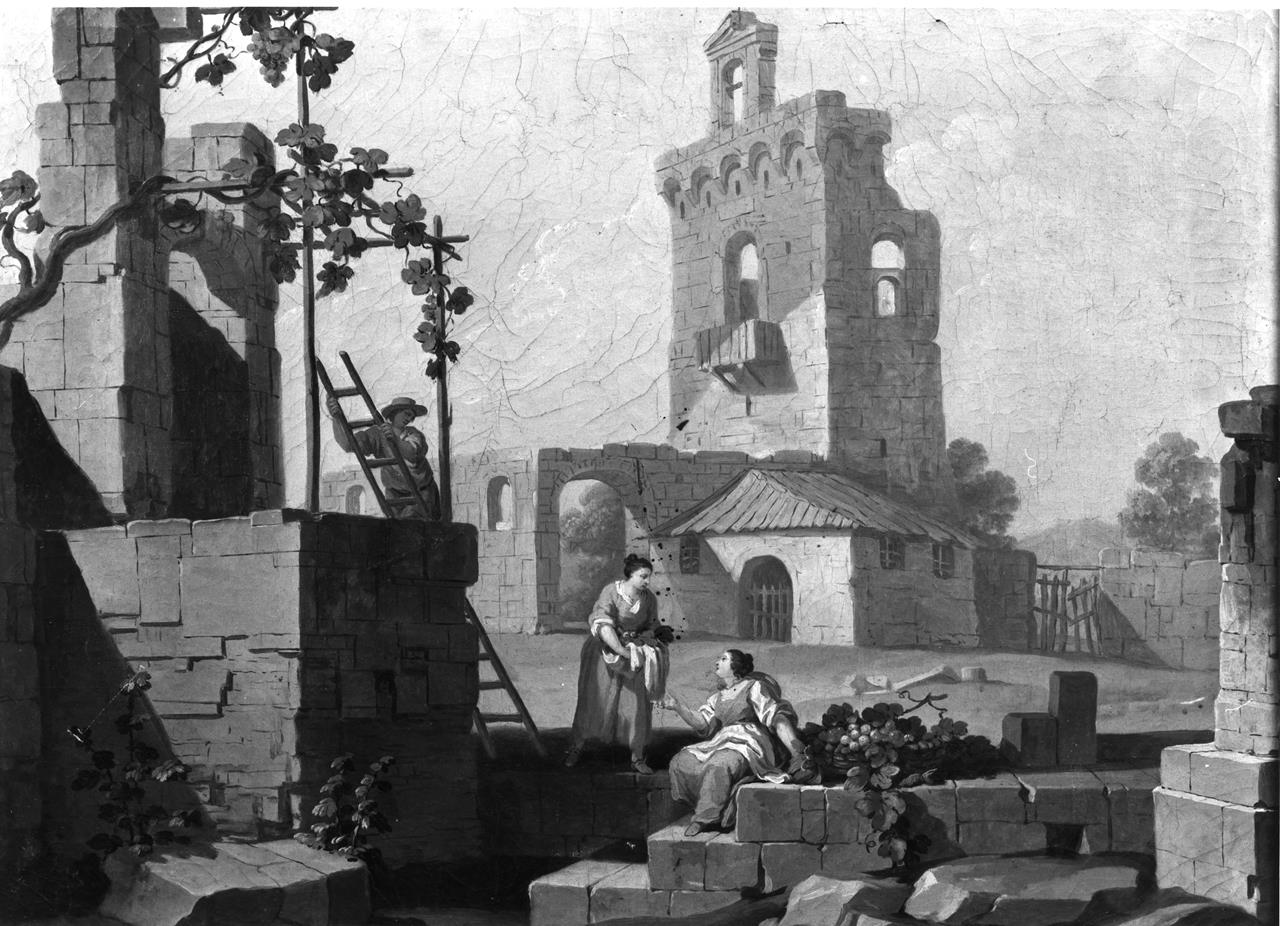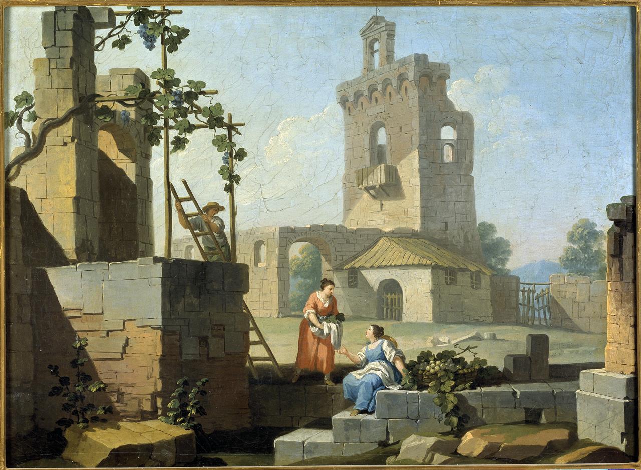 La struttura architettonica del dipinto risulta composta da rovine sparse, ma di suggestione medioevalistica e da costruzioni rustiche. Pampini, tralci di vite volti, un uomo su una scala, mentre scende da un pergolato, due figure di contadine a colloquio