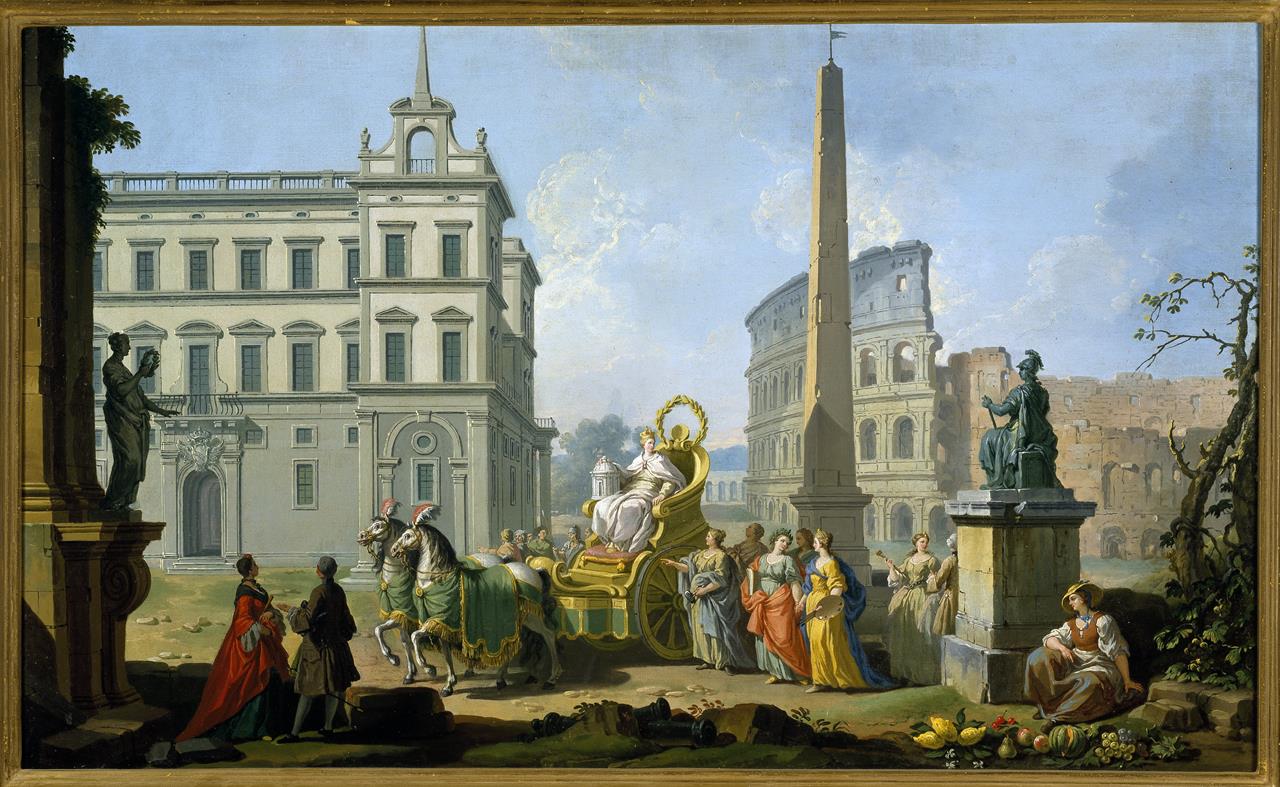 Eleganti edifici settecenteschi, ma anche una visione del Colosseo, un obelisco, statue classiche, fanno da cornice a Europa, che incede su un alto cocchio, trainato da cavalli inpennacchiati, con ricche gualdrappe. Una corona di alloro spicca a sommo del carro da cui Europa, sontuosamente drappeggiata e con il modellino di una cupola a tamburo in mano, si rivolge al seguito di dame e personaggi eleganti che le fanno ala. Il Palazzo mostra forme barocche, contenute di tipo fiorentino, con stemma di Francesco II sul portone (arme di Lorena entro aquila dell’Impero). I cannoni che si intravedono a terra, simboleggiano la potenza militare, la frutta e le contadine, l’Agricoltura. Nel corteo di dignitari si riconoscono Poesia e Pittura, mentre Architettura è simboleggiata dal modellino di cupola che Europa tiene in mano. L’obelisco, il Colosseo e la statua classicheggiante, rappresentano l’Impero Romano