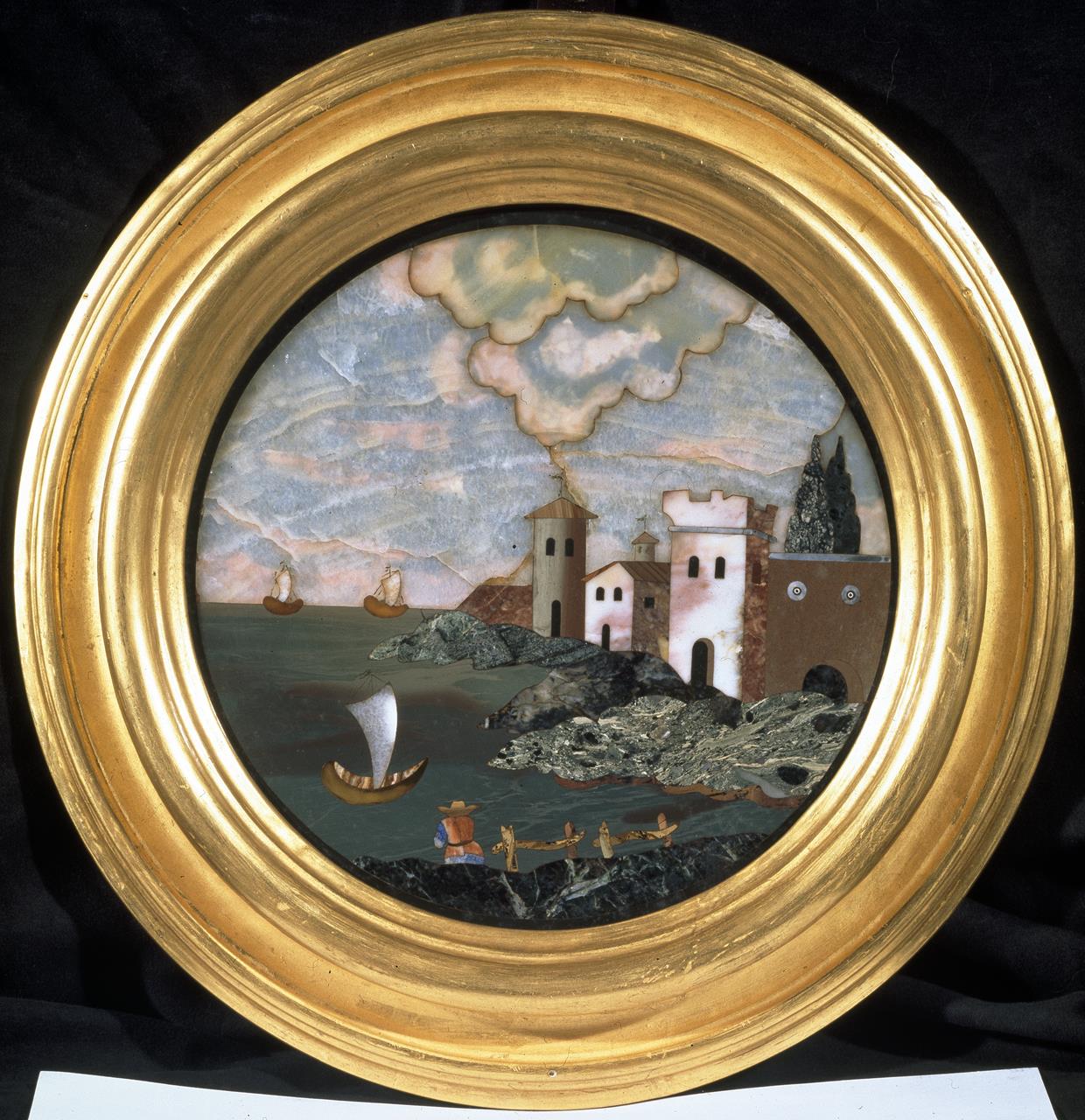 Commesso di pietre tenere raffigurante un quadretto rotondo con “Paesaggio marino”. Sulla sinistra il mare aperto su cui veleggiano alcune navi, in primo piano un uomo seduto, visto di schiena, che sembra essere intento alla pesca, sulla destra la costa, bassa e frastagliata, su cui si alzano alcune costruzioni. Al di là di un muro svettano le cime di due cipressi