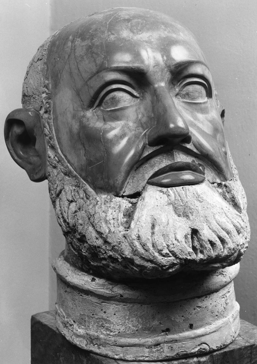 - NOTIZIE STORICO CRITICHE L’attribuzione della scultura al Buontalenti si deve a ricerche di Piero Sanpaolesi, che la identificò con un lavoro incompiuto del grande artista che si trovava in casa sua al momento della sua morte. Pochi giorni prima di questo evento, il 28 maggio 1608, veniva infatti compilato un inventario dei suoi oggetti e delle sue opere, fra cui venivano trovati vari disegni e progetti preparati dal Buontalenti per la Cappella dei Principi. Tra le cose citate c’è il modello di un busto e testa del Granduca Cosimo fatto di stucco e “...colorito per fare di pietra e tutto fatto di pezzi per accomodarsi con le pietre… e una testa di pietra cavata dal suddetto modello a grandezza conforme a che essere alla Cappella” (A.S.F., G.M. , filza 245, c. 454). mentre del modello si è persa ogni traccia, sembra che la testa si possa identificare con questa in esame. Sempre sulla scorta di documenti reperiti dal Sanpaolesi, veniamo a sapere che il Buontalenti,ormai in tarda età, si faceva aiutare dallo scultore Lorenzo Latini, in favore del quale sono stati trovati pagamenti nel 1607. Il Sanpaolesi rileva di questa scultura “la finezza delle superfici modellate lo studio accurato per ottenere, oltre alla somiglianza anche la morbidezza della carne, come per esempio nell’orecchio”. Questo frammento è di rilevante importanza poiché suggerisce il tipo di decorazione interna proposta dal Buontalenti per la Cappella dei Principi: i sarcofaghi dei granduchi dovevano essere sormontati da monumentali statue scolpite in pietre policrome