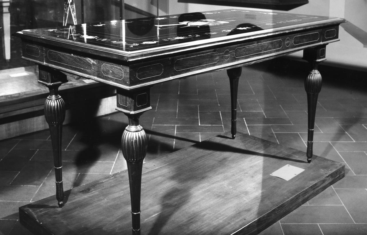 - NOTIZIE STORICO CRITICHE Questa tavola è una delle prime che Niccolò Betti prepara specificamente per la vendita al pubblico e, se il fondo è in marmo nero del Belgio – materiale poco pregiato – la lavorazione presenta tutta la cura e l’applicazione propria dei lavori per il Granduca dal disegno alle rifiniture Anche il tema compositivo è quello delle opere neoclassiche di Palazzo Pitti, l’emblema centrale con tipologie del repertorio neoclassico, ma è nella cornice con decorazioni naturalistiche che si rivela tutta la fresca inventiva del Betti, nonché la sua eccezionale capacità di esecuzione nel sottilissimo gioco di filettature, di riquadrature, che impongono una precisa conoscenza dei rapporti spaziali ed un grande gusto delle proporzioni. Il piano è completato da un sostegno, in ebano, anche esso di raffinata fattura nella straordinaria sottigliezza delle gambe in relazione al peso dell’oggetto: rappresentò l’Opificio all’Esposizione di Padova nel 1869 e a quella di Vienna del 1874