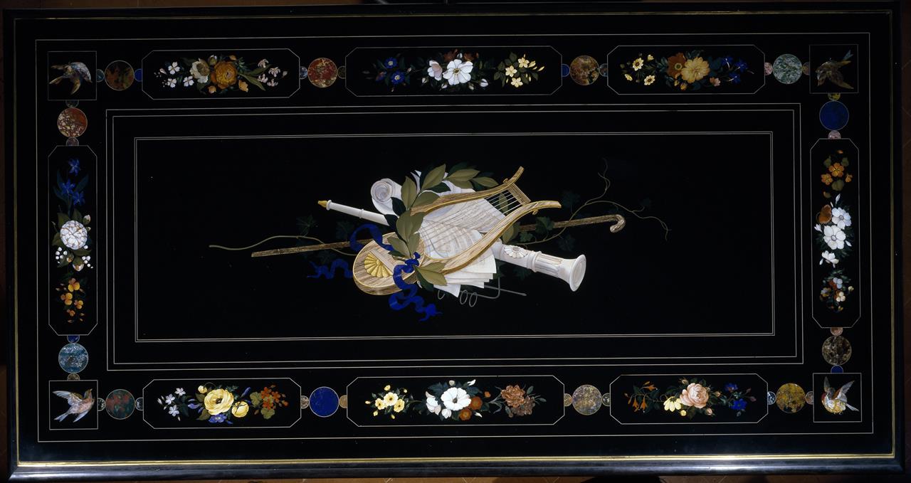 Piano rettangolare eseguito in commesso di pietre dure su fondo di marmo nero del Belgio. Presenta una fine cornice composta da un fregio di formelle con fiori, uccellini ai quattro angoli, specchiature di materiale. All’interno una nitida composizione di emblemi musicali classici, tibia, lira e cembalo intrecciati a racemi di fiori e ad una corona di alloro