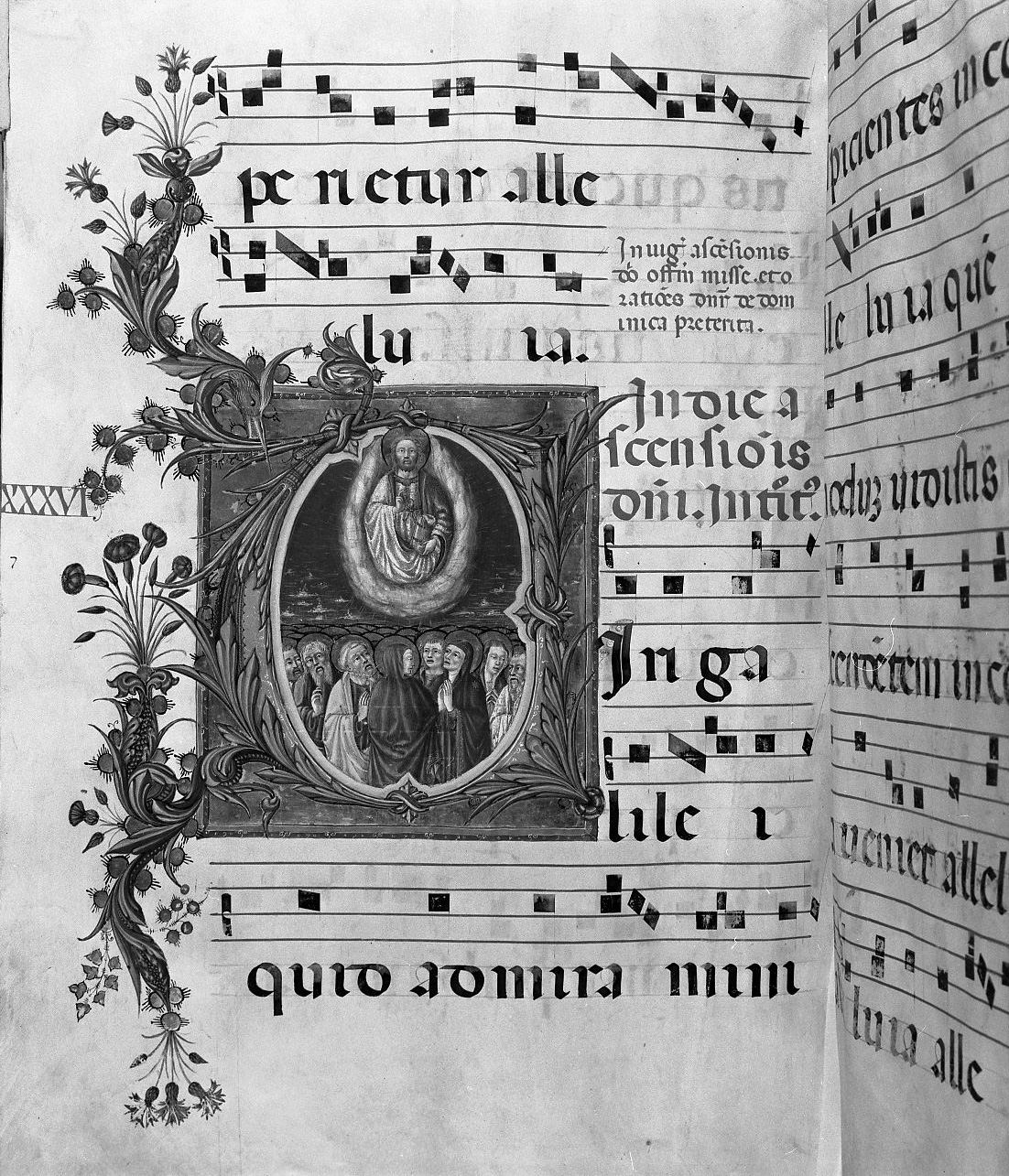 In un campo quadrato in oro zecchino profilato da una sottile cornice viola è inscritto il corpo della lettera "V" (Vir...) porpora internamente incorniciato di giallo fasciato da cespi di foglie d'acanto allungate verdi e azzurri che si allungano a sinistra in tralci ondulanti arricchiti da foglie porpora e rosse e mazzi di fiordalisi. Entro il corpo della lettera è raffigurata l'"Ascensione" sullo sfondo di un cielo ultramarino in cui in alto entro una mandorla di nuvole compare Cristo benedicente e in basso si affollano la Vergine, Santi e Apostoli aureolati