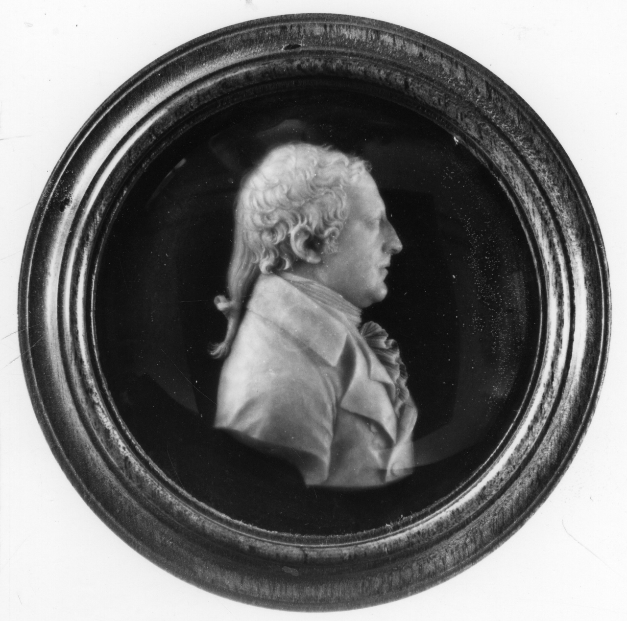 Rilievo in cera arancio su fondo di vetro nero raffigurante un busto maschile in profilo a destra con codino. Cornice rotonda in legno con vetro convesso di protezione