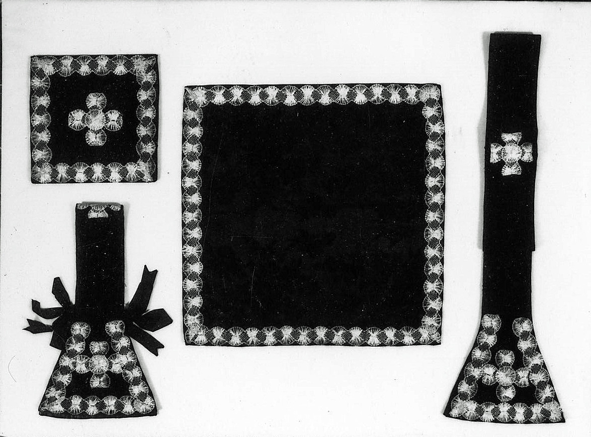 paramento liturgico composto da pianeta, stola, manipolo, borsa e velo da calice. Il paramento liturgico è in seta nera operata a mazzi composito di rose e miosotis, congiunti fra loro da sottili tralci simmetrici. La fodera è in tela di cotone lucidata; le trine sono lavorate a fuselli in argento filato, riccio e lamellare