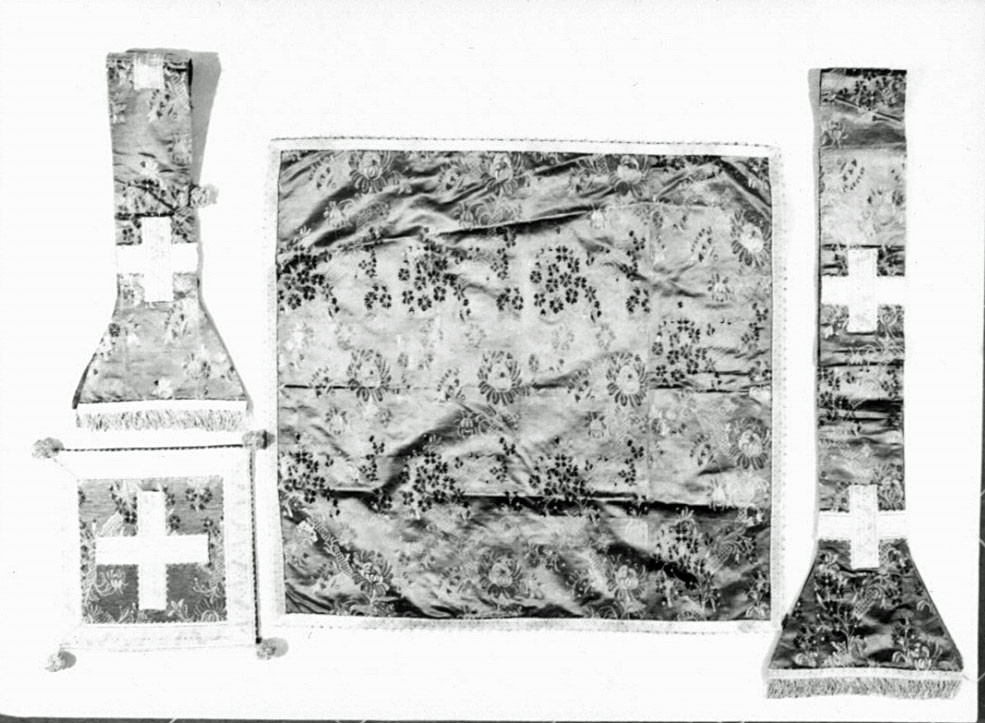 Una pianeta con stola, manipolo, borsa e velo di calice in raso di seta rosso pallido, damascata in sete policrome e bianco. Galloni in seta bianca e argento filato di cm 1,5 e 3,5. Frange in argento filato di cm. 4; fodere in taffetas rosso pallido