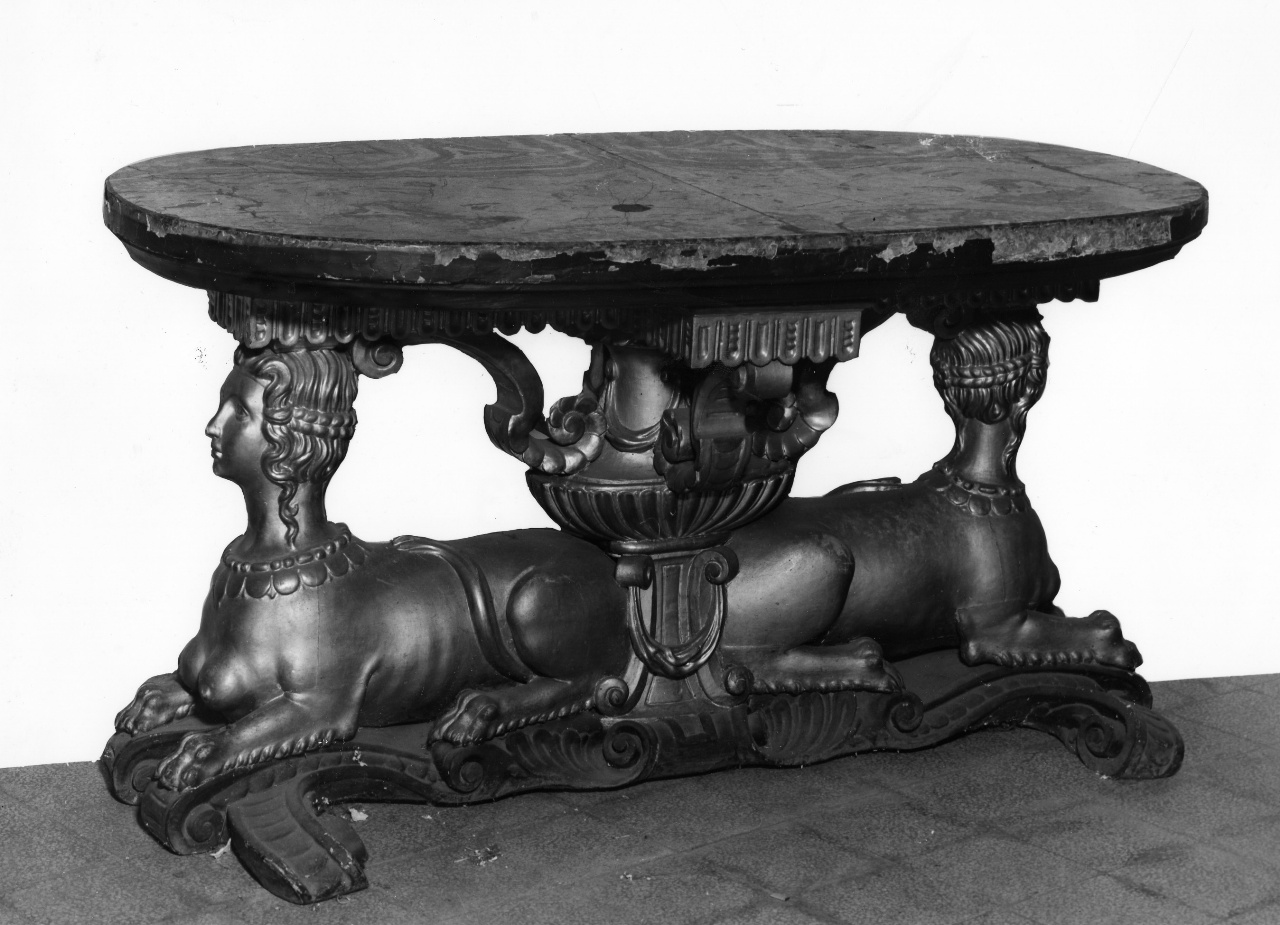 Il tavolo ovale con piano di marmo poggia su di un basamento formato da due traverse a croce e sorretto da un vaso baccellato con collo biansato e da due sfingi dai dorsi affrontati poggianti su volute
