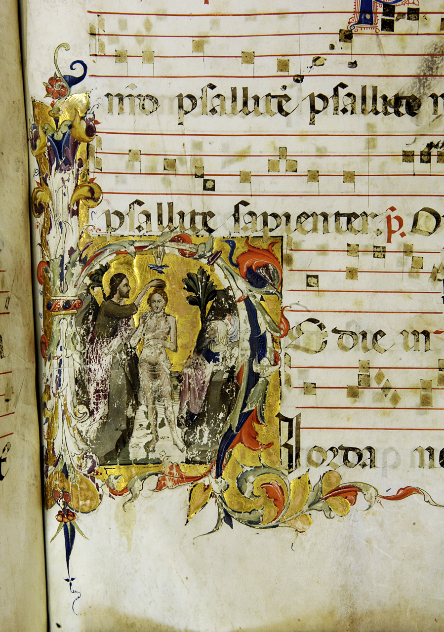 Iniziale fogliata media con storia e caudata H(odie in Iordane), rubr. Responsorius. Il corpo della lettera, azzurro, è ricoperto di foglie verdi, arancioni, color porpora e gialle; il campo e parte del fondo sono in foglia d’oro. Cristo è rappresentato nell’asse mediano della scena e sotto i suoi piedi scorre il fiume Giordano, sulla destra è il Battista nell’atto di versargli l’acqua in testa, sulla quale scende la colomba dello Spirito Santo mentre, sulla destra, due donne assistono alla scena