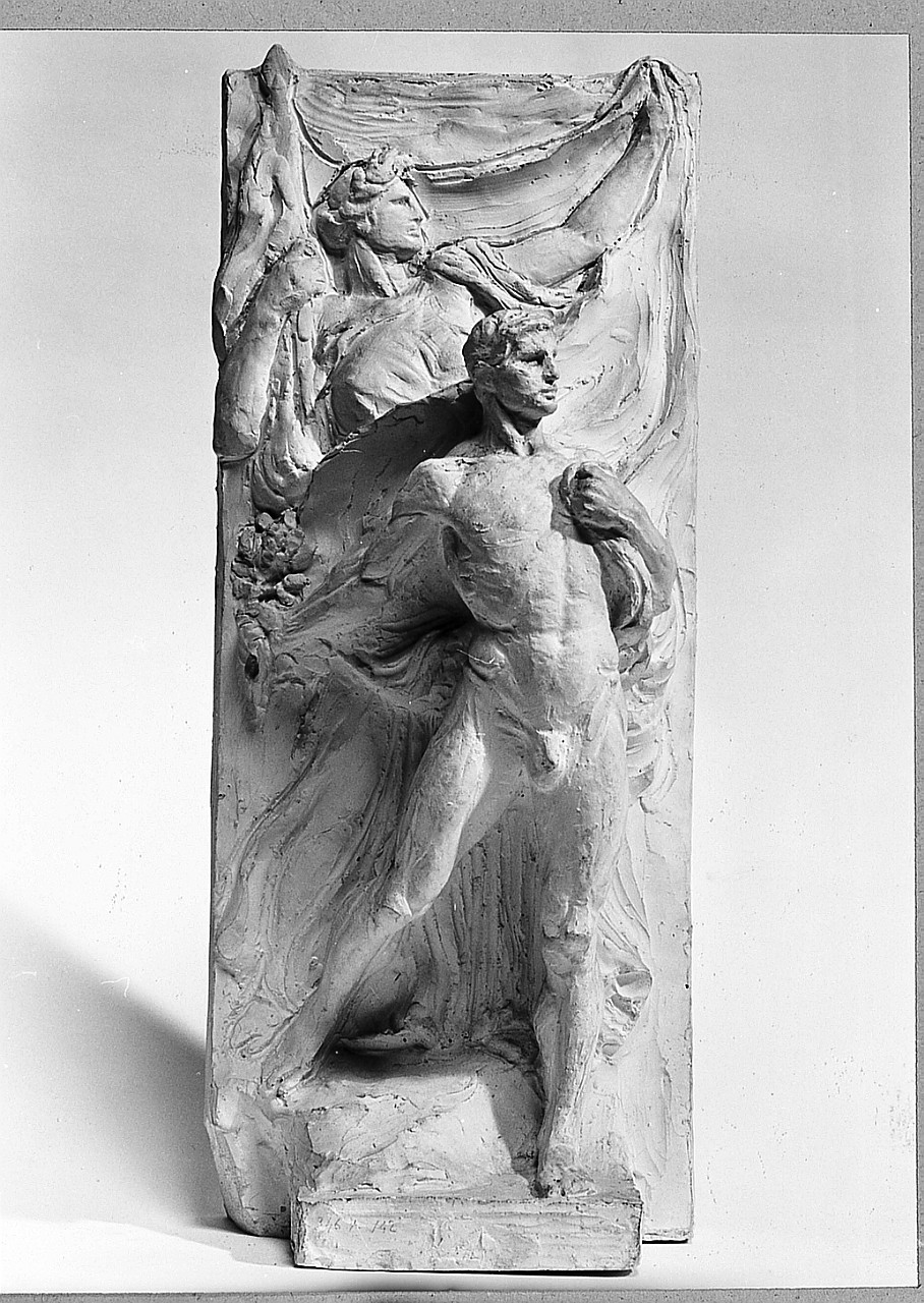 - NOTIZIE STORICO CRITICHE Si tratta di un bozzetto preparatorio per il gruppo del "Trionfo del popolo italiano" eseguito da Trentacoste fra il 1910 e il 1913, posto con il suo pendant, il "Risveglio", a lato dell'entrata principale della facciata di Montecitorio progettata dall'architetto Ernesto Basile (per i tempi e le modalità di realizzazione vedi scheda n. 33). L'altorilievo venne interpretato da Ojetti come "il Trionfo del Popolo che s'avanza imperioso con un ramo di quercia nella sinistra e con la destra stretta a un lembo della bandiera alzata su di lui dalla figura allegorica dell'Italia" (V. Ojetti, "Il nuovo Palazzo del Parlamento", in "la lettura", XIII, 11, novembre 1913, p. 979) e nalogamente da Diego Angeli, come il genio del Trionfo che "avanza potente e superbo, sospinto dalla grande figura della Patria" (D. Angeli, "Le statue del nuovo palazzo del Parlamento nello studio di D. Trentacoste", in "Giornale d'Italia", 15/X/1913). Il bozzetto è più vicino alla redazione finale del suo pendant. La figura del genio vittorioso deriva direttamente dalla figura del "Conquistatore" sul rovescio della medaglia del Duca degli Abruzzi, opera che, insieme bassorilievi eseguiti per l'Esposizione di Torino del 1903 e al "Caino" esposto a Venezia nel 1903 (vedi scheda n. 87) conteneva già quel carattere di estetismo eroicizzante e celebrativo che viene qui portato alle sue estreme gonseguenze. Il bozzetto, insieme al suo pendant venne donato al Comune di Firenze per la GAM da Fernanda Ojetti, erede fiduciaria di Trentacoste, nel 1933