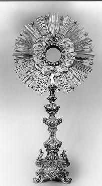 La base troncopiramidale, poggiante su piedi a cartoccio, è costituito da una mensola sostenuta da volute e al centro della quale sono poste tre cartelle a sbalzo. La mensola sostiene tre angioletti eseguiti a fusione e tre teste di cherubini inserite tra due volute che sostengono il fusto. Questo è definito da una serie di tre nodi a vaso e troncopiramidali decorati a sbalzo con cartigli, volute floreali, teste di cherubino e con corone di foglioline. Intorno alla teca vi è una grande raggiera a raggi irregolari e dorati e decorata con teste di cherubino in una corona di nubi. Sedici stelle con pietre incastonate decorano la raggiera