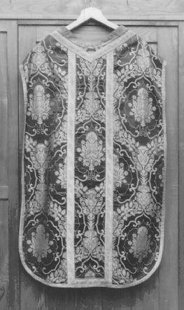 Pianeta viola con disegno in giallo. Ampie maglie ovali disposte a scacchiera, definite da tralci con fiori di loto in boccio. Nei punti di tangenza, al centro, un fiore di melagrana stilizzato. Fodera originale in tela rosacea stinta