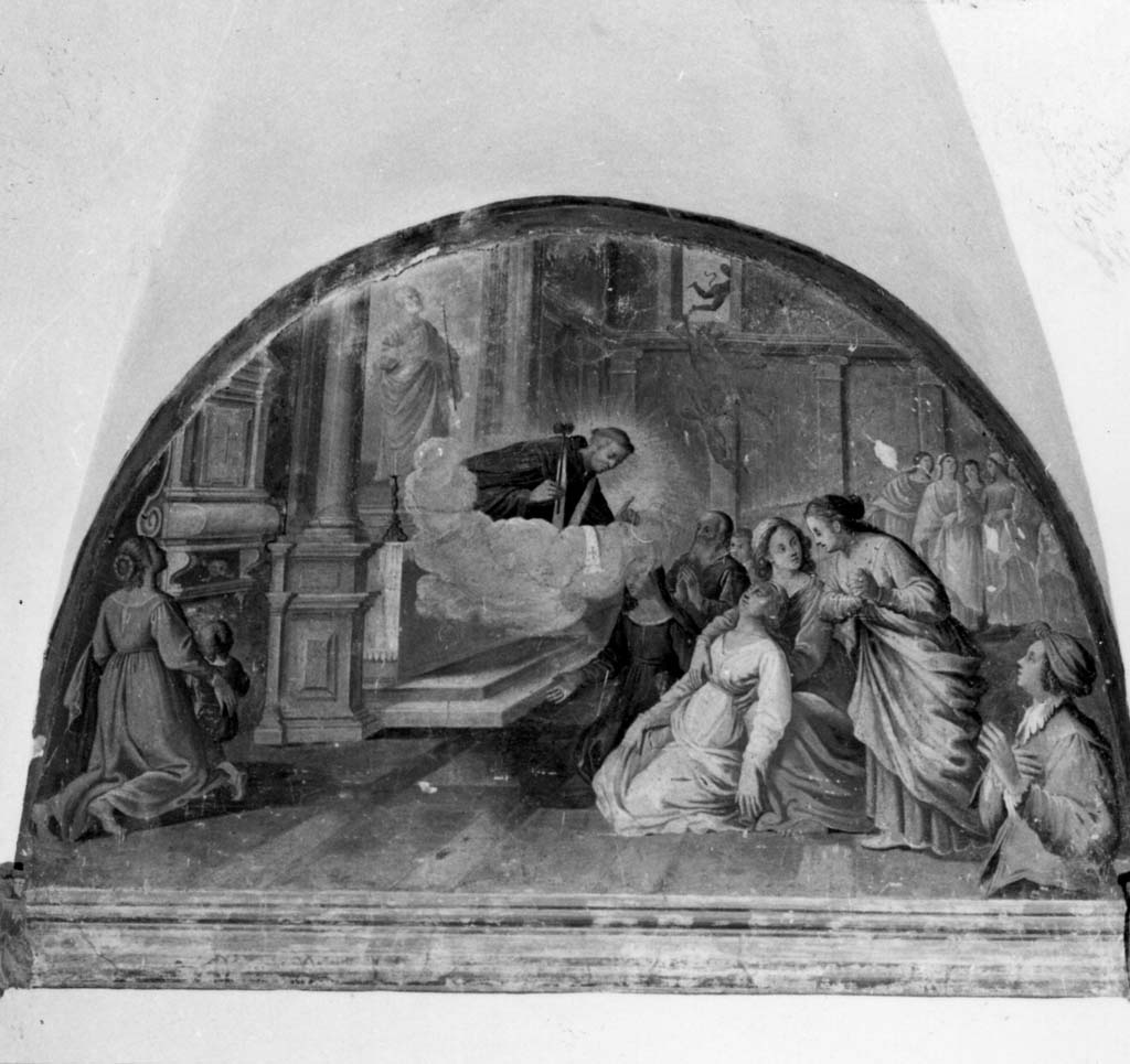 - NOTIZIE STORICO CRITICHE La lunetta fa parte di un ciclo di 25 storie raffiguranti i miracoli di San Filippo Benizi; gli affreschi sisviluppano sui quattro lati del chiostro del convento dei Servi di Maria diviso in due parti dopo la soppressione; nove storie si trovano quindi nella parte del chiostro adibita a scuola media, e sedici in quella ancora di proprietà del convento. Nel 1988 sono state rinvenute sotto le lunette le relative iscrizioni