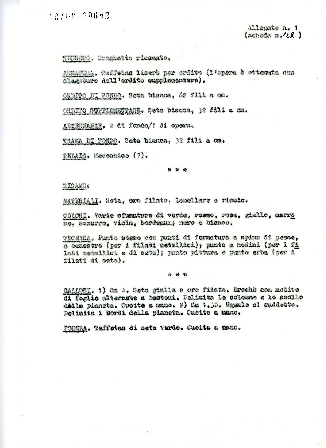 - NOTIZIE STORICO CRITICHE Risulta difficile proporre la provenienza di questo ricamo. Sicuramente trae espirazione dai tessuti "Revel" della metà del XVIII secolo (Tessuti antichi nelle chiesa di Arona, 1981, Torino, p. 164; Paramenti e arredi nelle contrade di Siena, 1986, Firenze, tavv. 61, 64, 65). Il ricamo di qualità veramente notevole, per la ricercatezza decorativa conferita dalle cornucopie e per lo spiccato naturalismo evidenziato da sfumature preziose, può essere collocato verso la fine del XVIII secolo. Un esempio simile è pubblicato sul catalogo di una mostra senese: Paramenti e arredi nelle contrade di Siena, 1986, Firenze, tav. 99