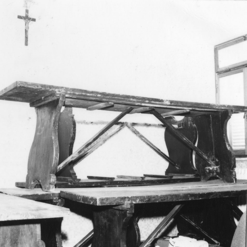 - NOTIZIE STORICO CRITICHE Il tavolo fratino vero e proprio era in origine stretto e lungo perchè doveva essere appoggiato alla parete in quanto i commensali sedevano ad un unico lato. Ancora nel XV-XVI sec. si designavano con questo nome tavoli diversi, ma caratterizzati da certi moduli, come per esempio le mense, che rimangono di sobria struttura e di taglio rustico. I cinque tavoli fratini in questione sono in noce e castagno