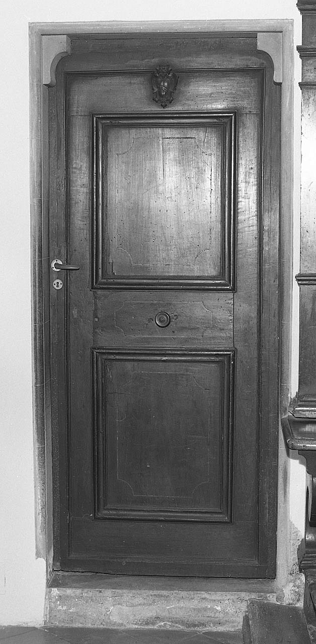 Porta in legno con doppia riquadratura inserita in uno stipite a mensola. Al centro è un pomello sostituito in epoca recente; anche la maniglia è un'aggiunta moderna. Sopra la riquadratura più alta, in posizione centrale, è un'arme gentilizia in legno intagliato. La superficie presenta una verniciatura in colore marrone scuro