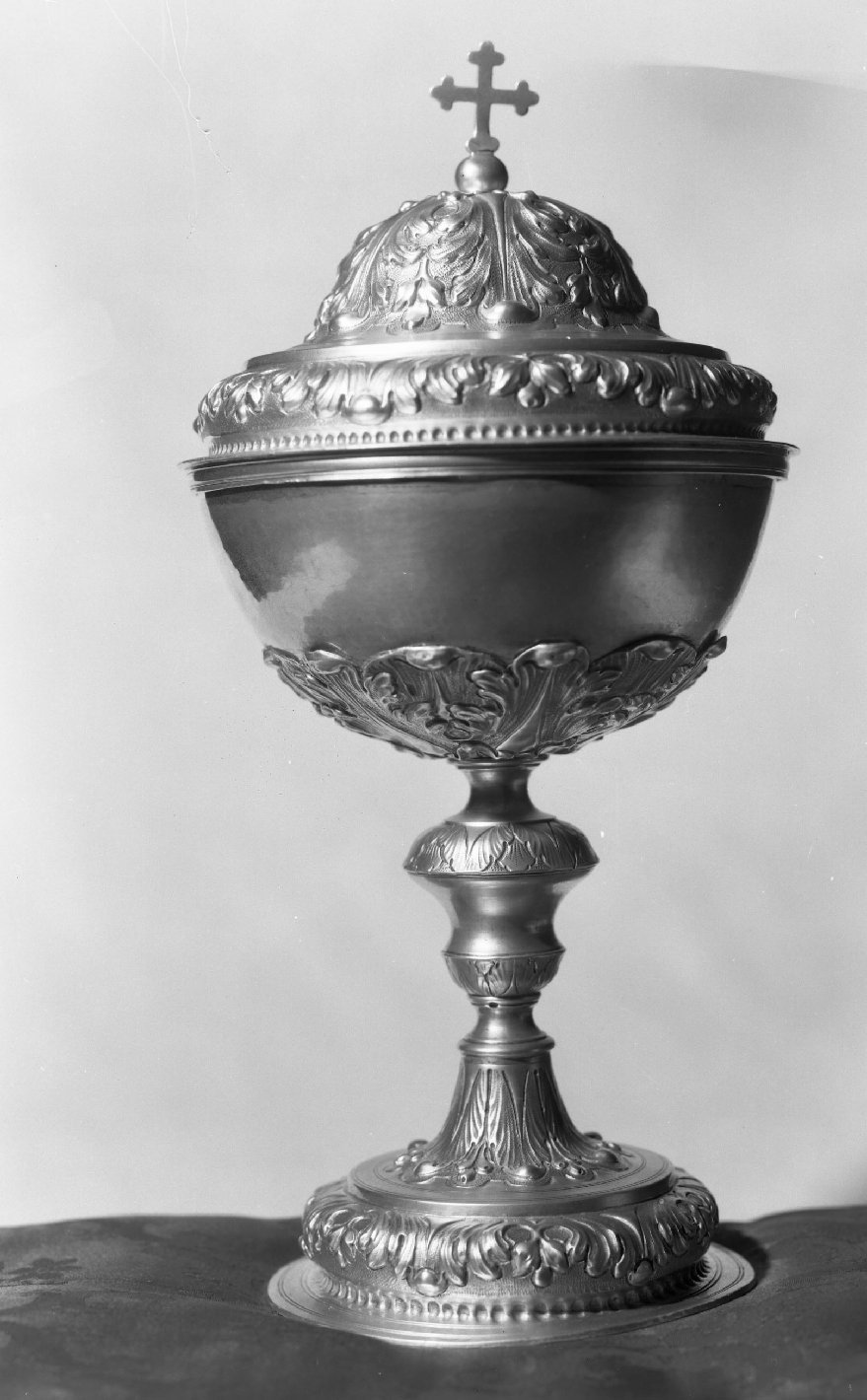 - NOTIZIE STORICO CRITICHE Questa pisside è ricordata nel recente inventario della chiesa (A. Gallorini, 1989, fasc. II). Anch'essa, come altri argenti della chiesa, reca una sigla che la rende riferibile alla committenza del Preposto Ippolito Rossi. La presenza del punzone con il leone rampante la potrebbe far collocare nell'ambito di una produzione fiorentina della quale è inoltre caratteristica la triplice punzonatura. La pisside ha inoltre una forma ed una decorazione molto diffuse nel territorio toscano. Si colloca ancora vicino ad esemplari settecenteschi pur privilegiando una maggiore stilizzazione ed una decorazione più appiattita (cfr. G. Cantelli, Poppi. Mostra dei paramenti e delle arti minori nelle chiese del Casentino, Firenze 1968, n. 42, fig. 38)