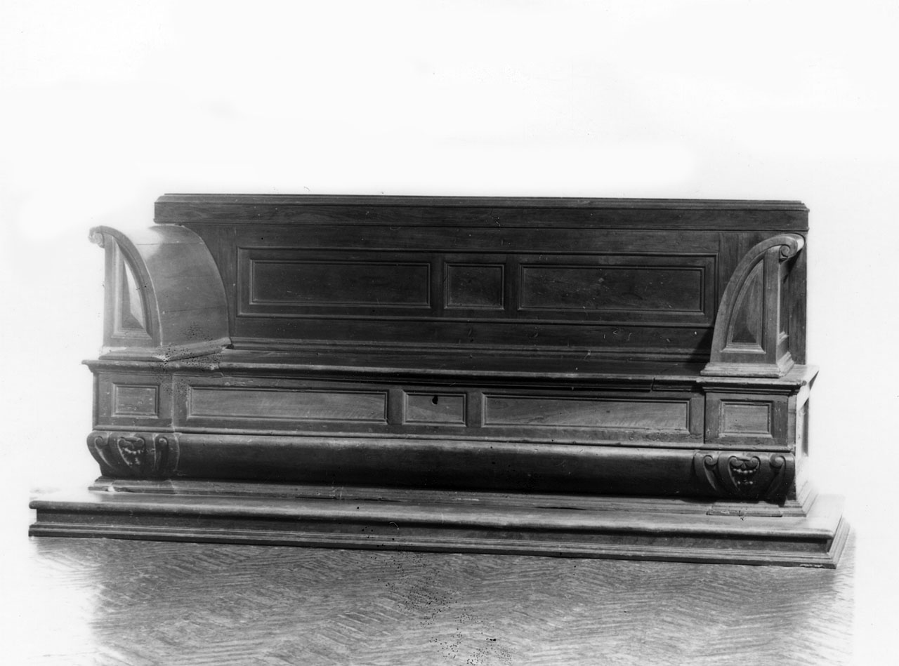 Divani con piedistallo, impostati su basamento a cassa decorato da riquadri a modanature, con parte inferiore leggermente rientrante, piano di seduta liscio ribaltabile, braccioli a voluta, spalliera rettangolare ripartita di cornici leggermente aggettanti