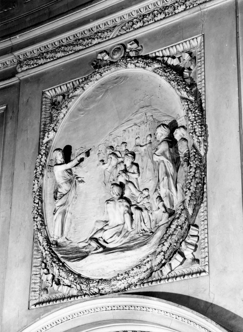 - NOTIZIE STORICO CRITICHE Il rilievo, raffigurante un Episodio della vita di Sant'Jacopo Apostolo cui era dedicata la cappella, risale al momento del riallestimento dopo il 1782. E' opera di buona mano, dello stesso autore del pendant sulla parete di fronte, che tratta con sicurezza la scena complessa, dalla resa dei panni e del nudo in primo piano, al rilievo bassissimo del paese sul fondo. Si inserisce nella tradizione della scultura tardo barocca fiorentina, sensibile ormai ad un classicismo sempre più evidente dopo la metà del secolo