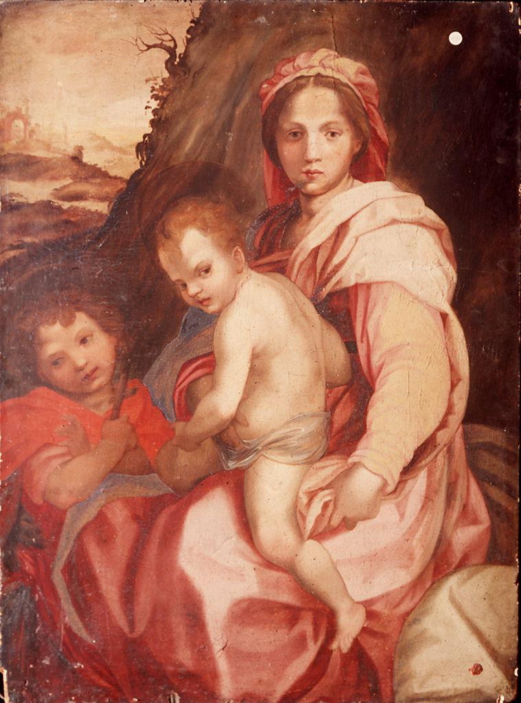 - NOTIZIE STORICO CRITICHE Si tratta di una copia cinquecentesca del quadro appartenente alla Antony de Rothschild Collection di Ascott, ritenuto a sua volta una buona copia, da un esemplare perduto di Andrea del Sarto, dal Freedberg (1963), e invece, opera autografa dallo Shearman (1965), seguito dal Cecchi e dal Natali (Andrea del Sarto 1989). Il Freedberg ritiene il quadro di Pitti di qualità inferiore di quello di Ascott ma forse più fedele all'originale in alcuni particolari, specie nel paesaggio e nel senso di monumentalità delle figure. Altre copie appartenenti alle Gallerie Fiorentine sono i nn. 1890/ 9416 e Castello/402
