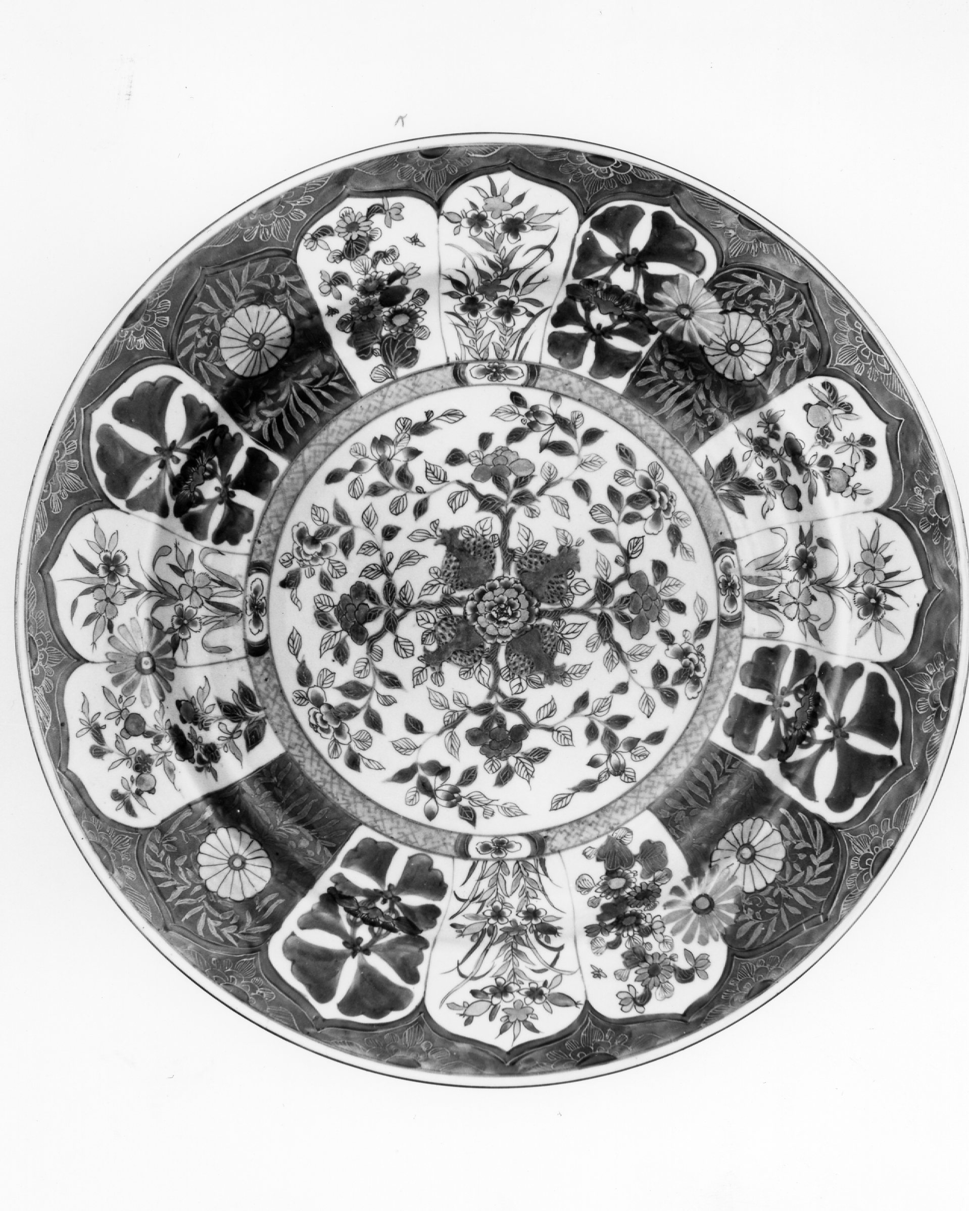 - NOTIZIE STORICO CRITICHE Porcellana di tipo Imari. Decorazione dipinta in blu di cobalto sotto coperta, rosso e oro al di sopra dell'invetriatura trasparente dai lievi riflessi azzurrati. Presenta cornici, cartigli con composizioni a motivi floreali. L'orlo è filettato in oro, mentre sul retro si isolano due rametti fioriti. Simili pennellature e melograni analoghi nel medaglione centrale si ritrovano in due piatti conservati presso il Topkapi di Istambul