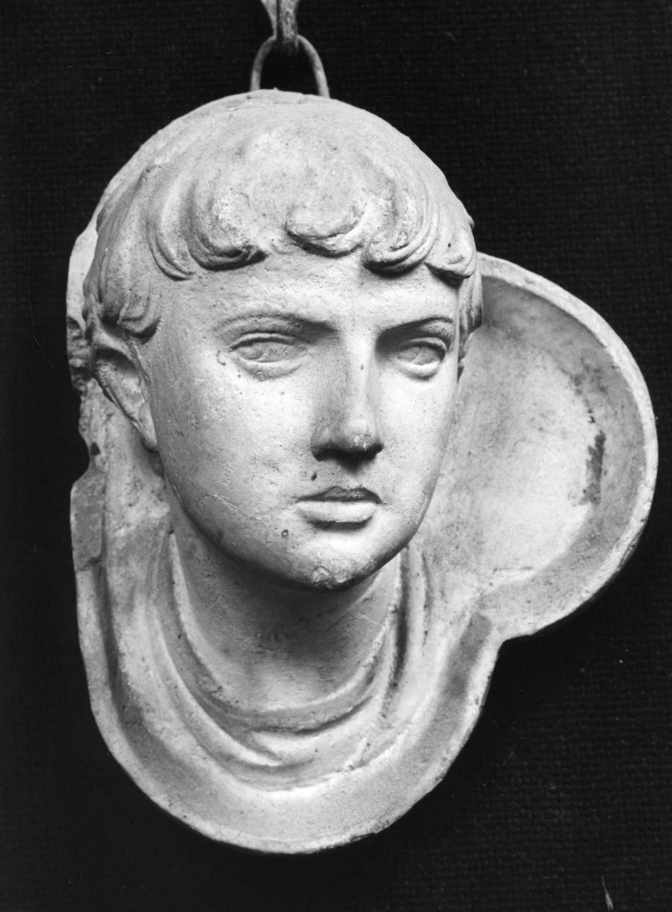 Calco in gesso da forma con gelatina. Testa di giovane che sporge da una cornice trilobata